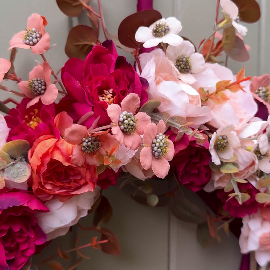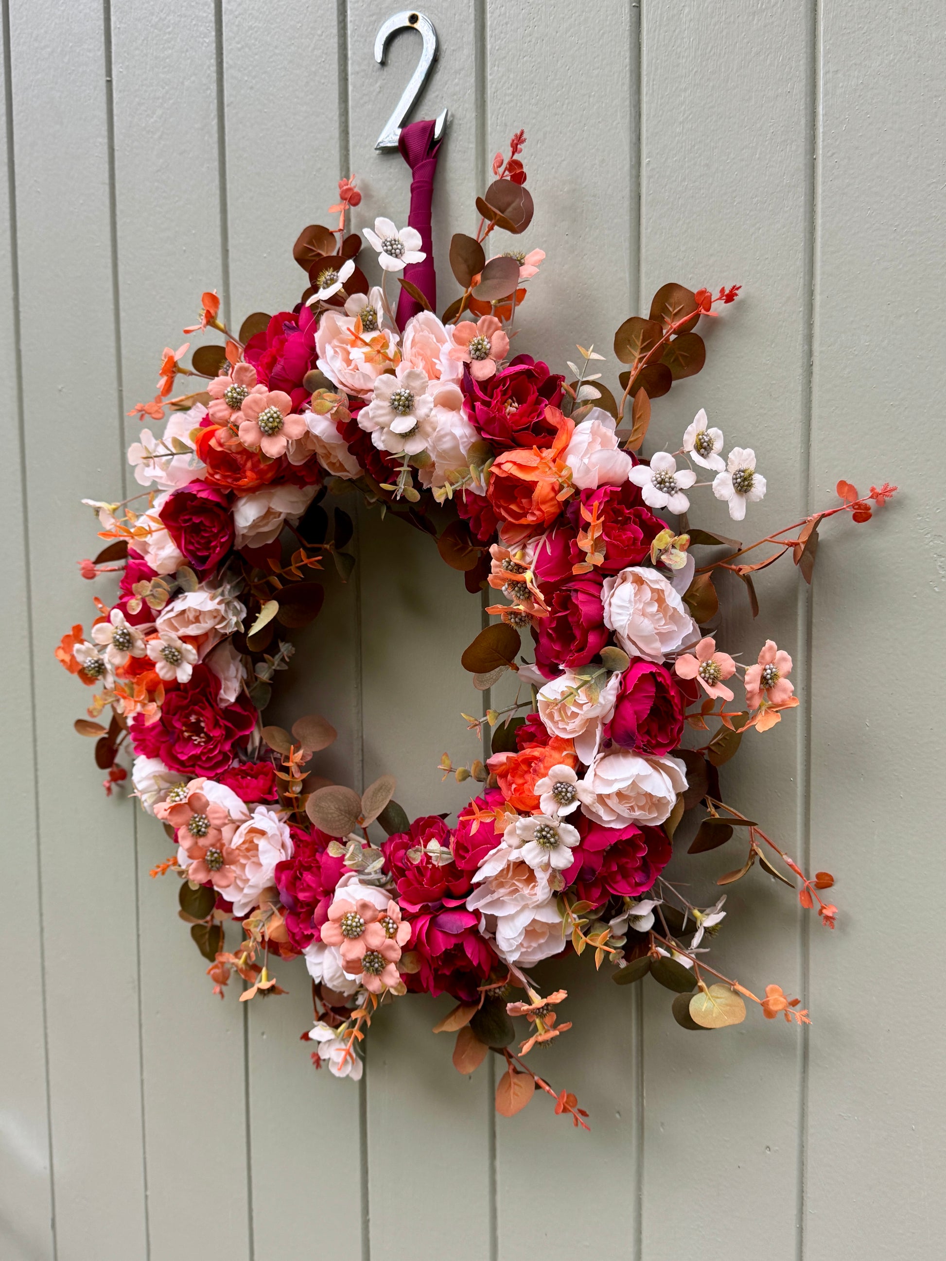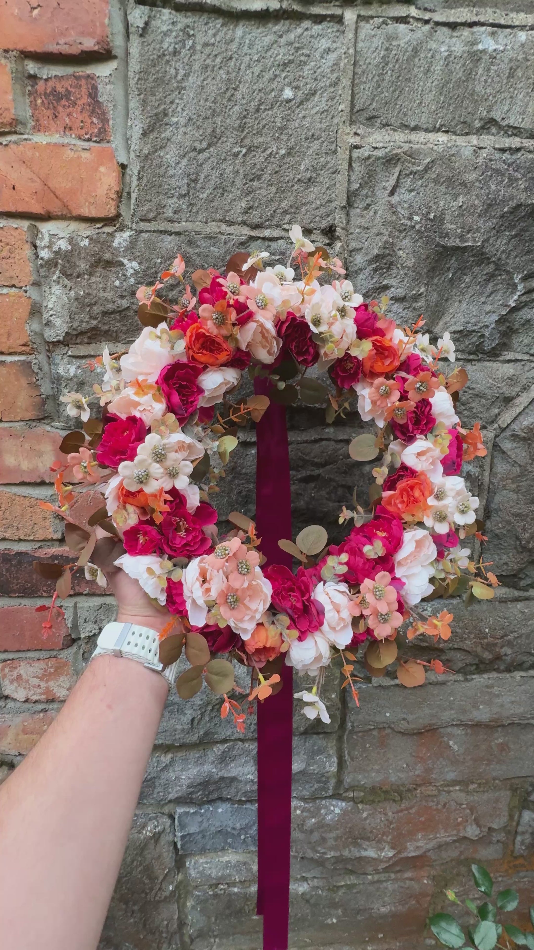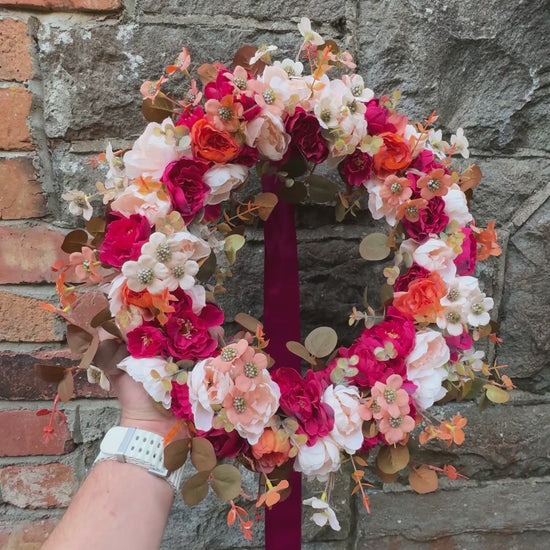 Celebrate the warmth of the season with our “Blush & Berry Bloom” wreath. Deep berry reds, soft blush tones, and coral accents mingle with earthy eucalyptus for a design that feels both vibrant and cozy. Like the first chill in the air paired with golden sunsets, this wreath brings autumn’s charm straight to your doorstep.