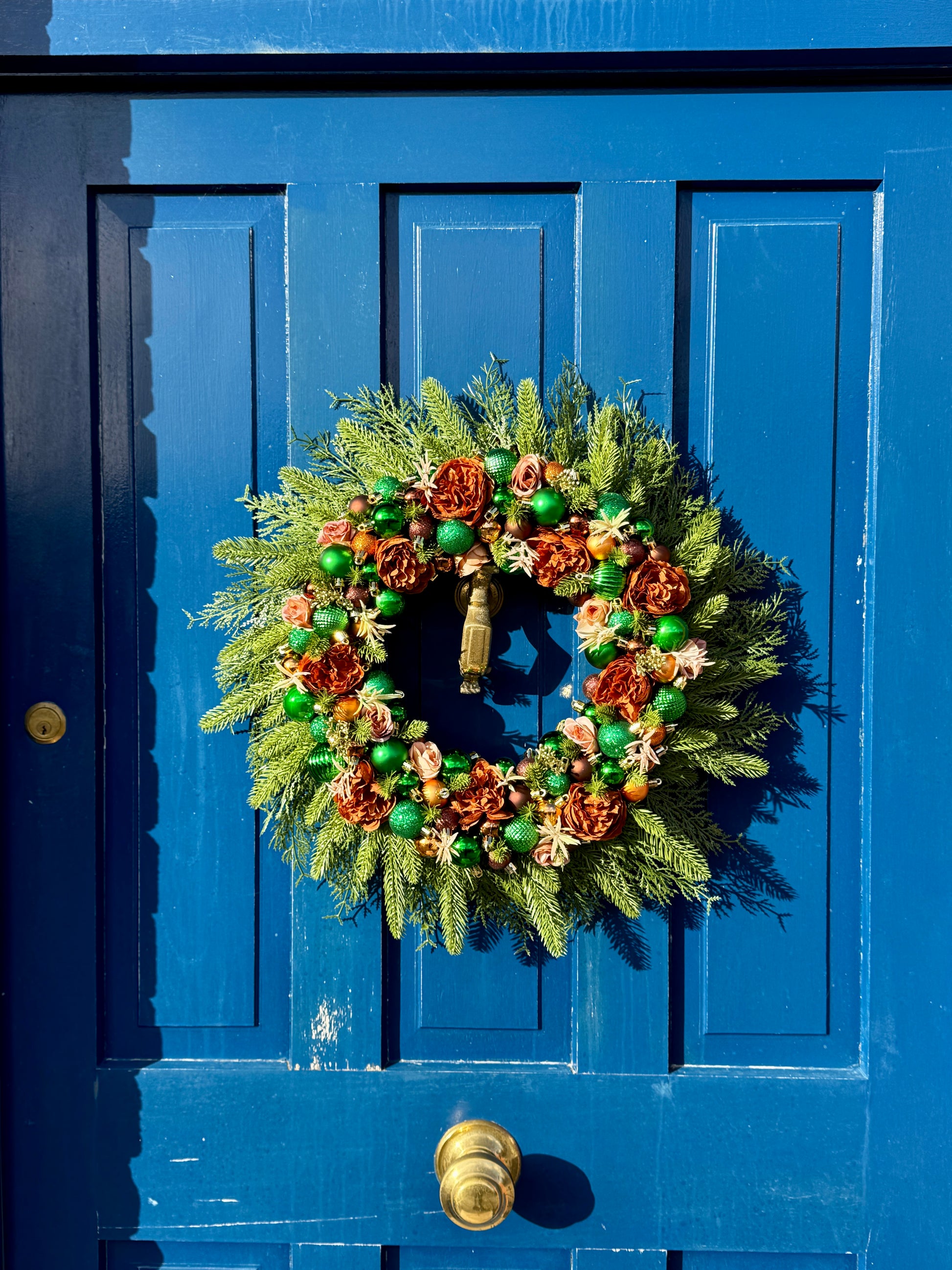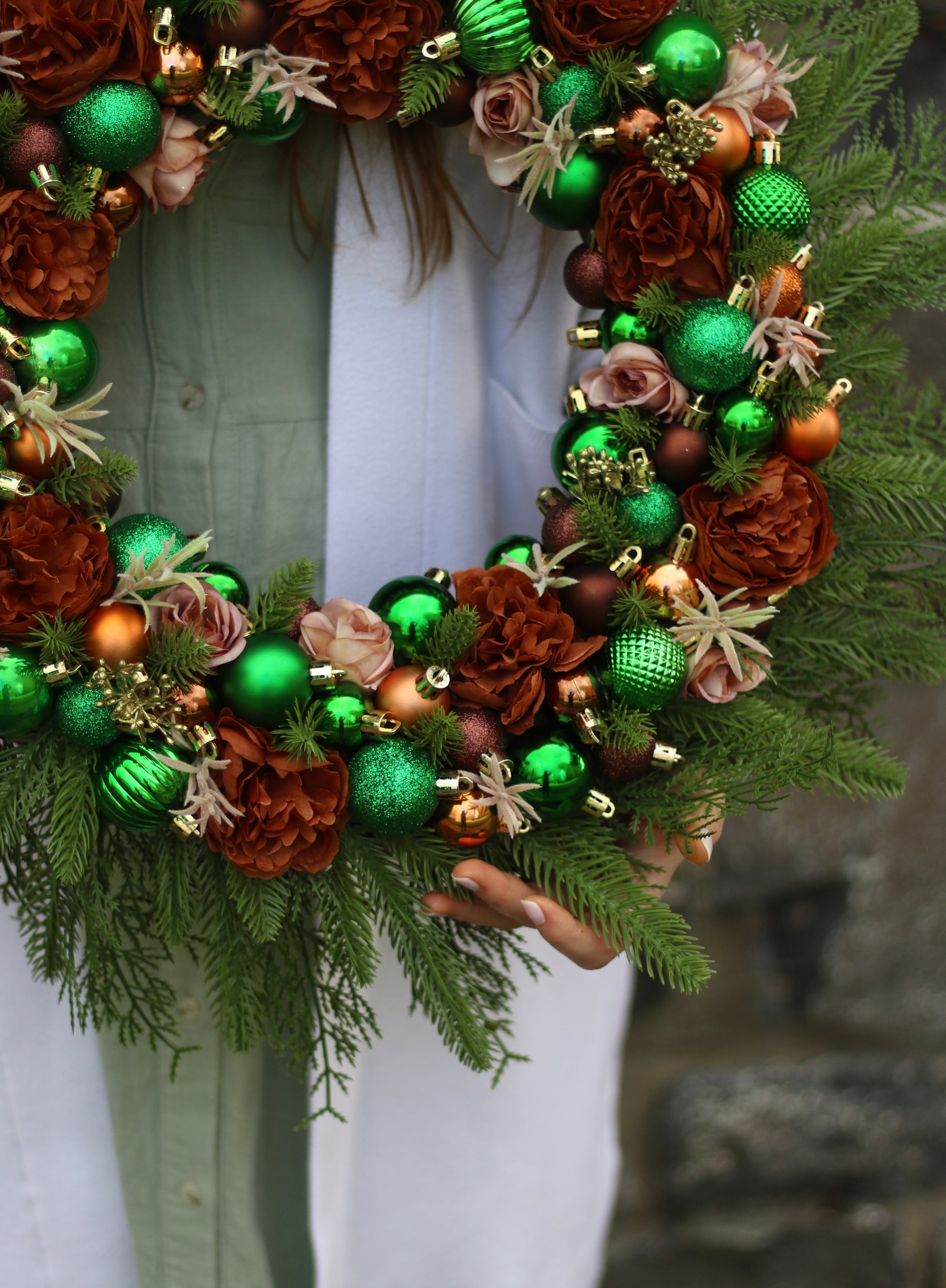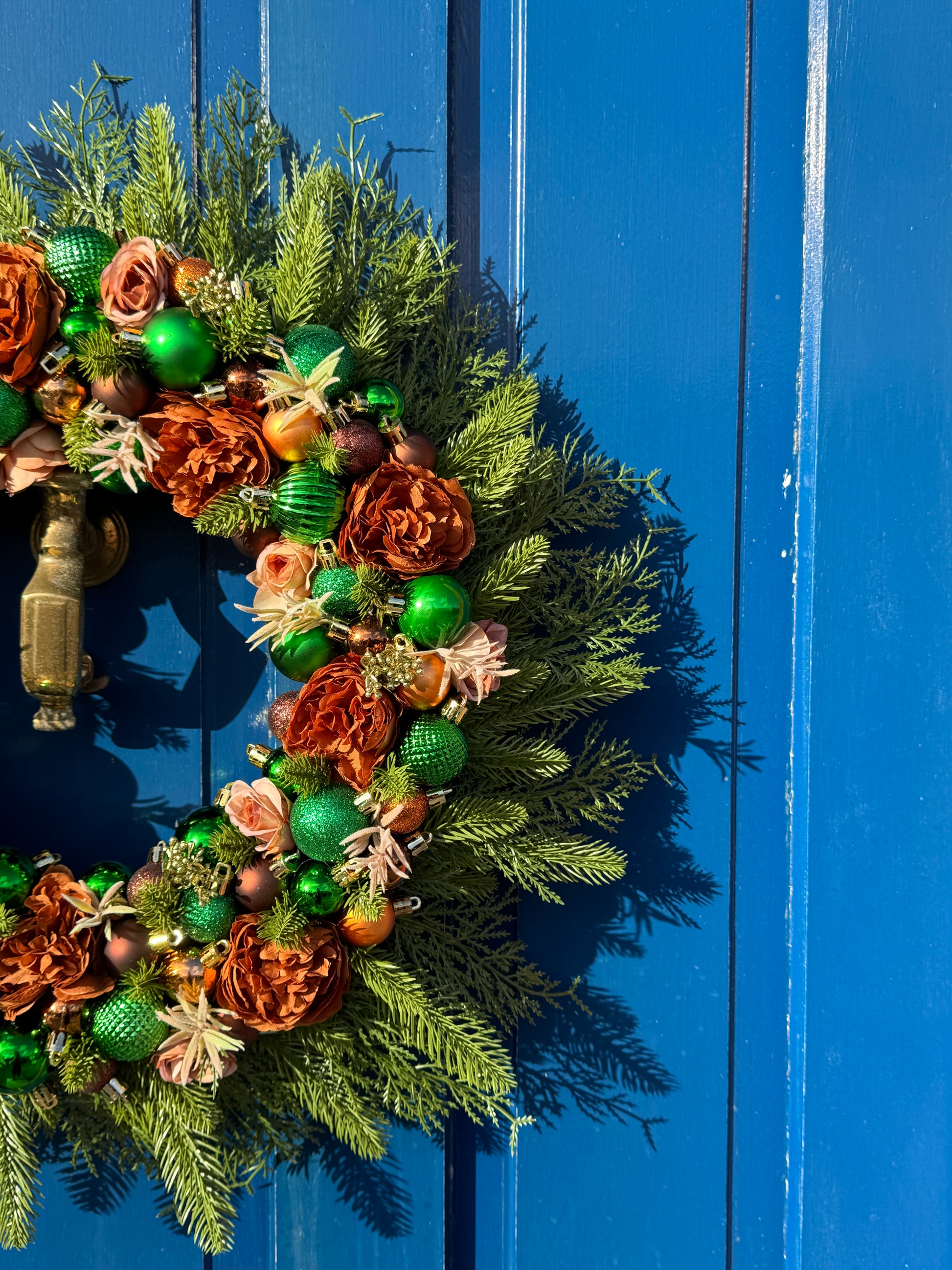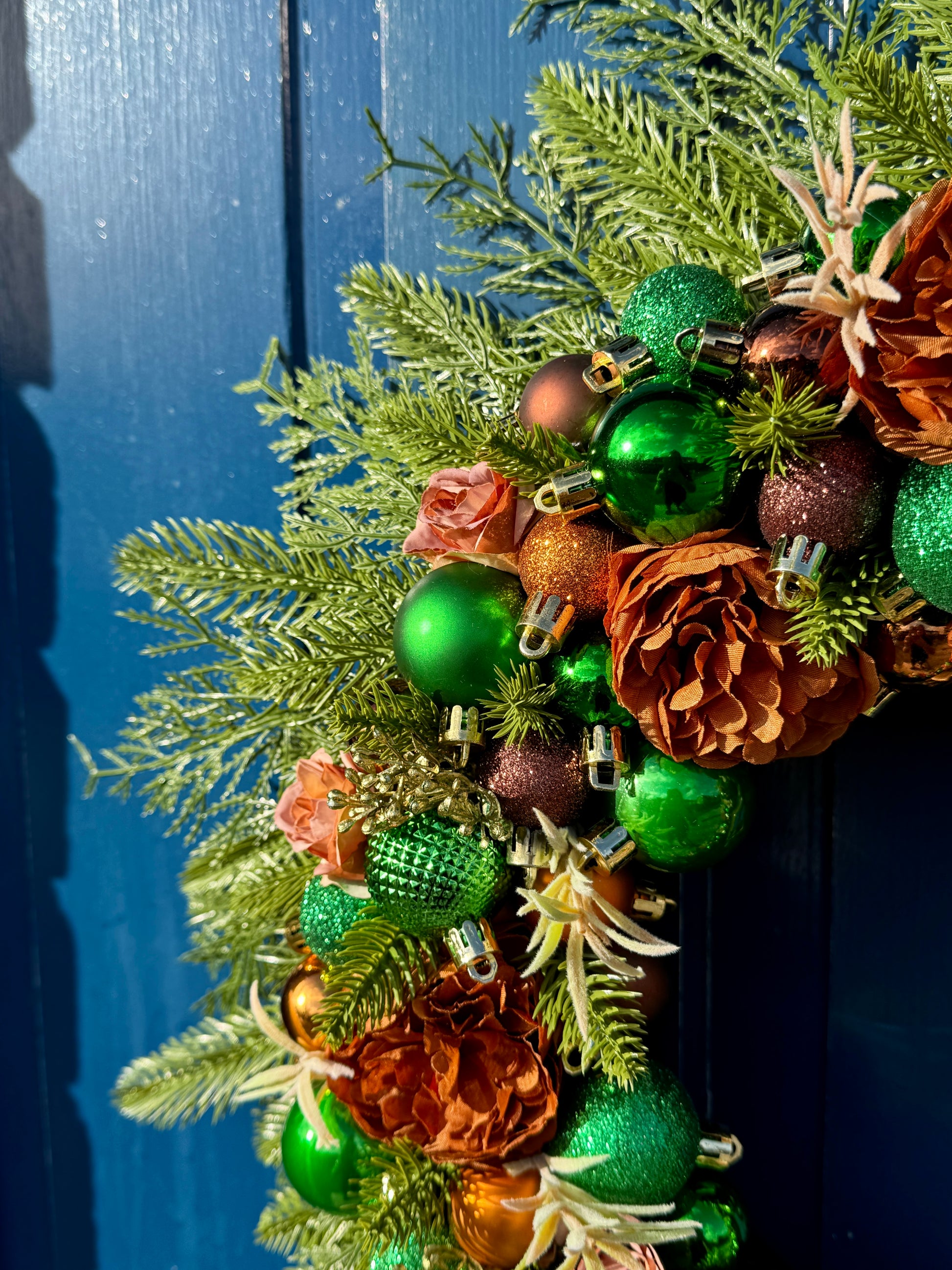 This wreath blends deep copper tones with forest greens — a cozy mix that feels earthy, festive, and full of charm.