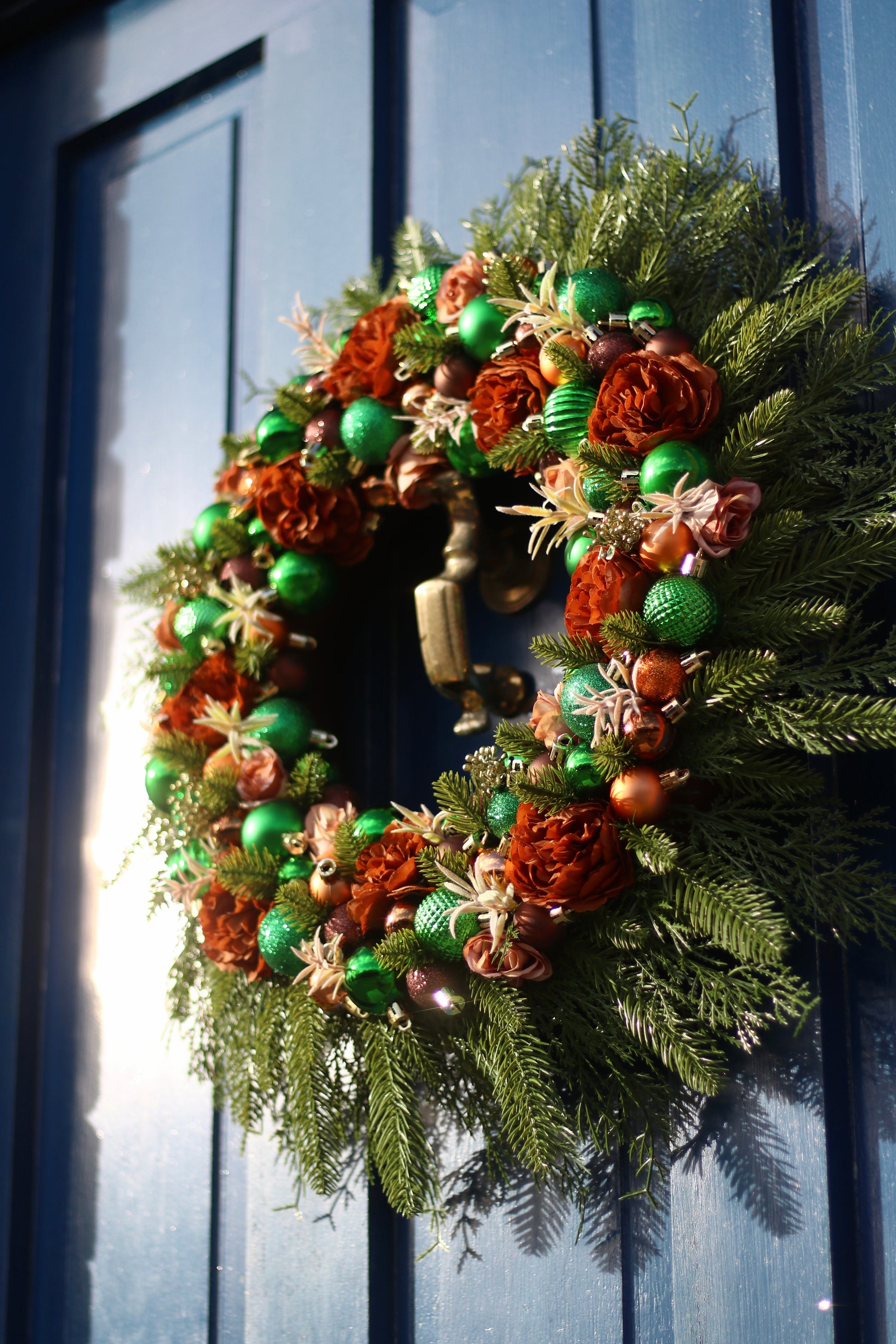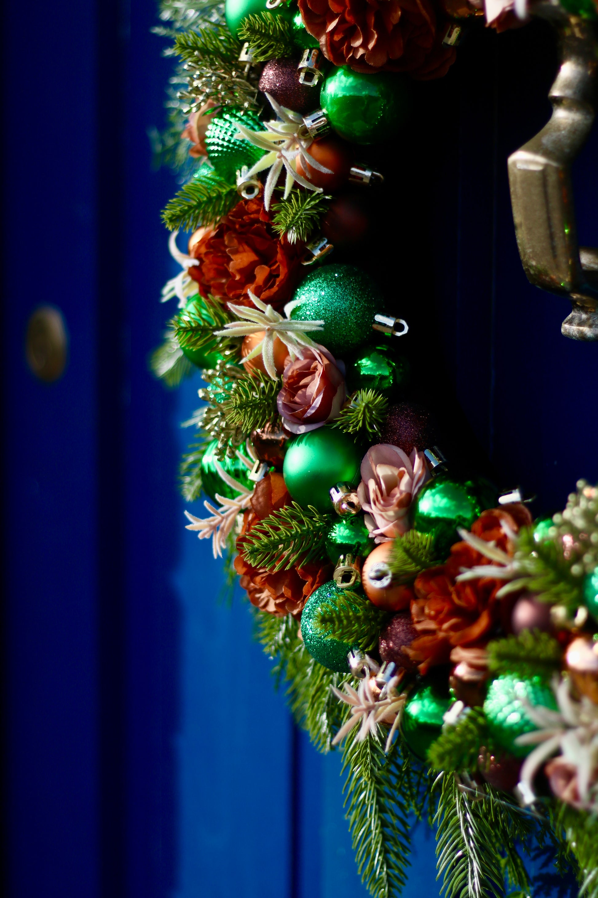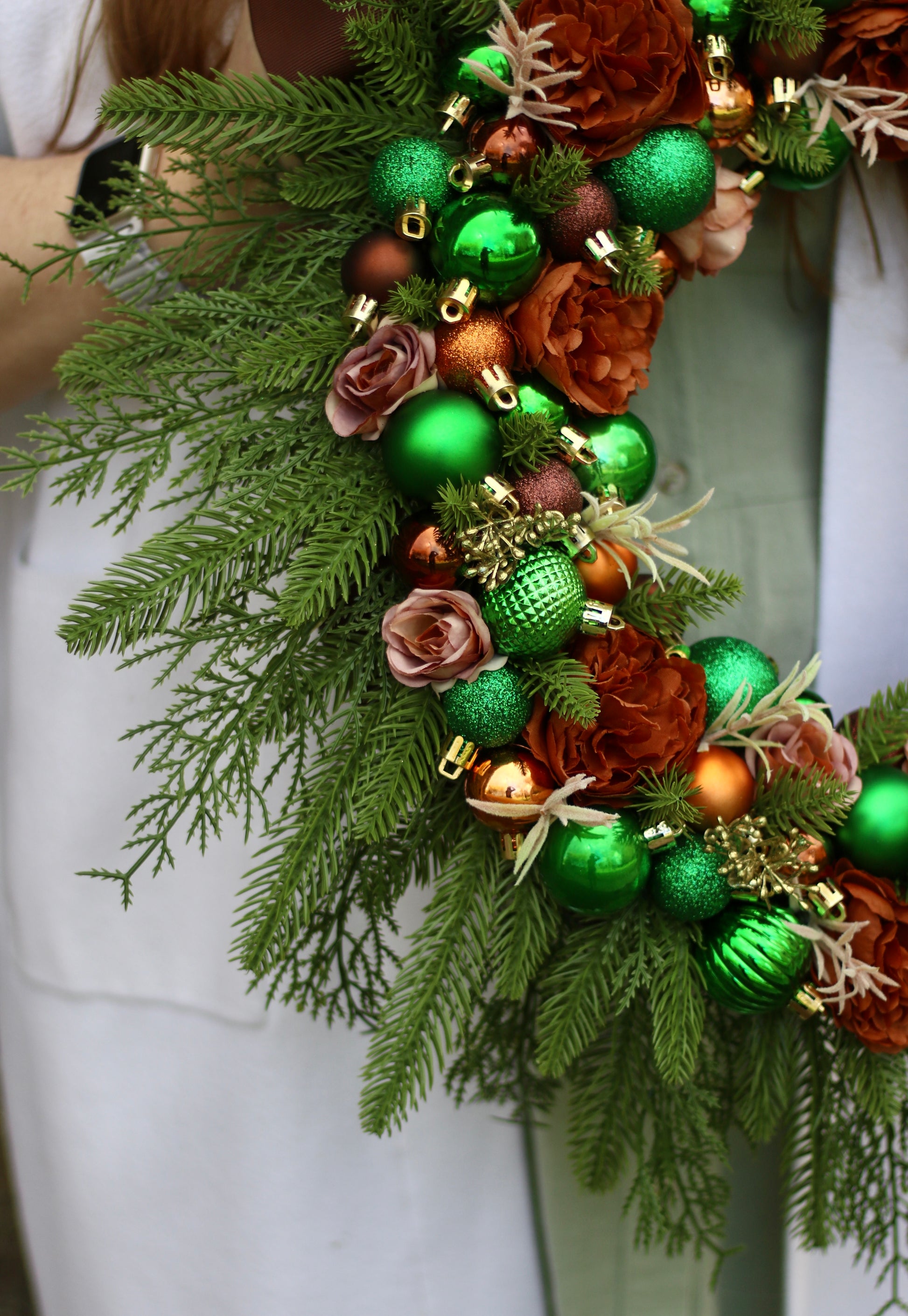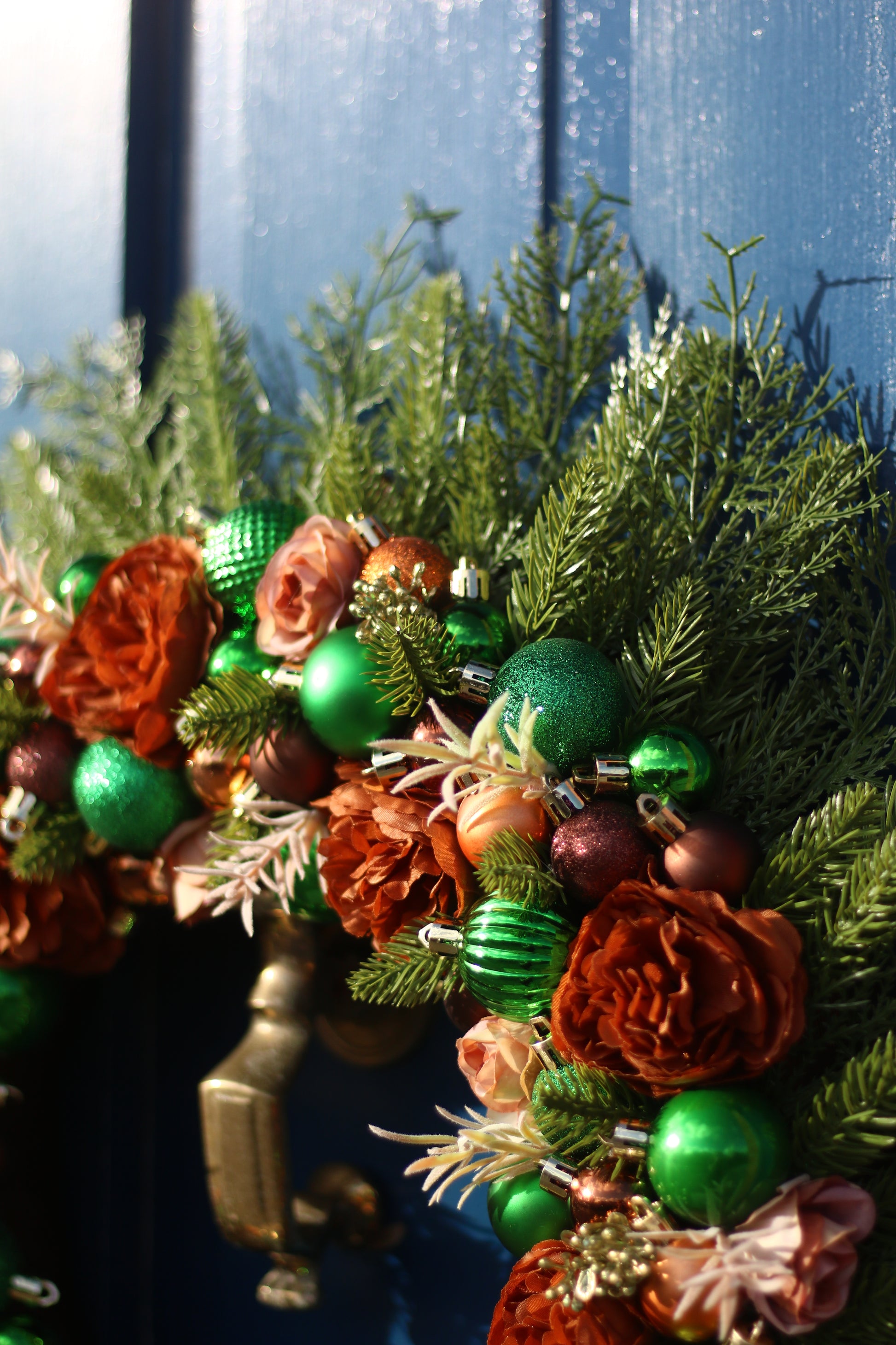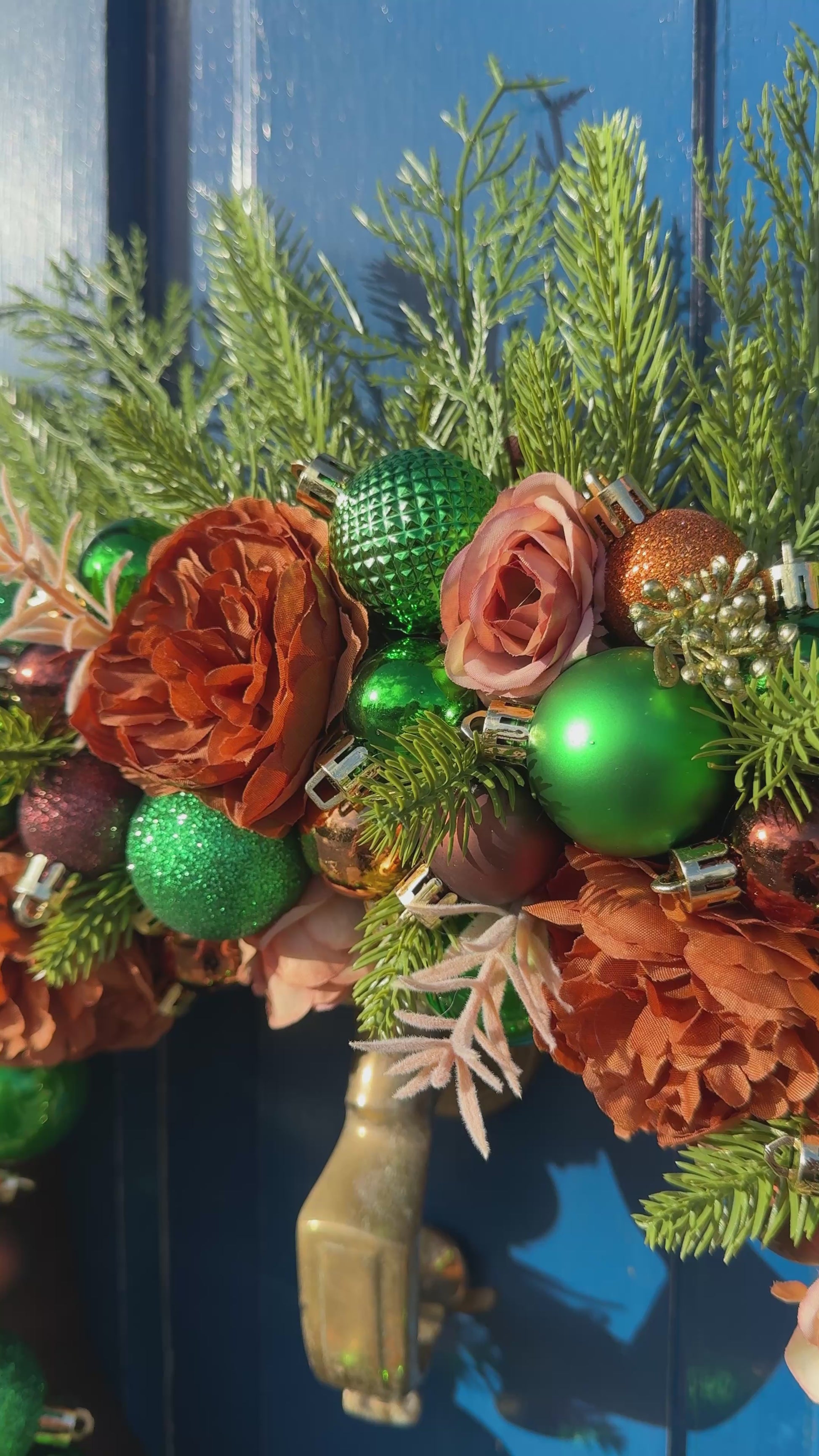 This wreath blends deep copper tones with forest greens — a cozy mix that feels earthy, festive, and full of charm.