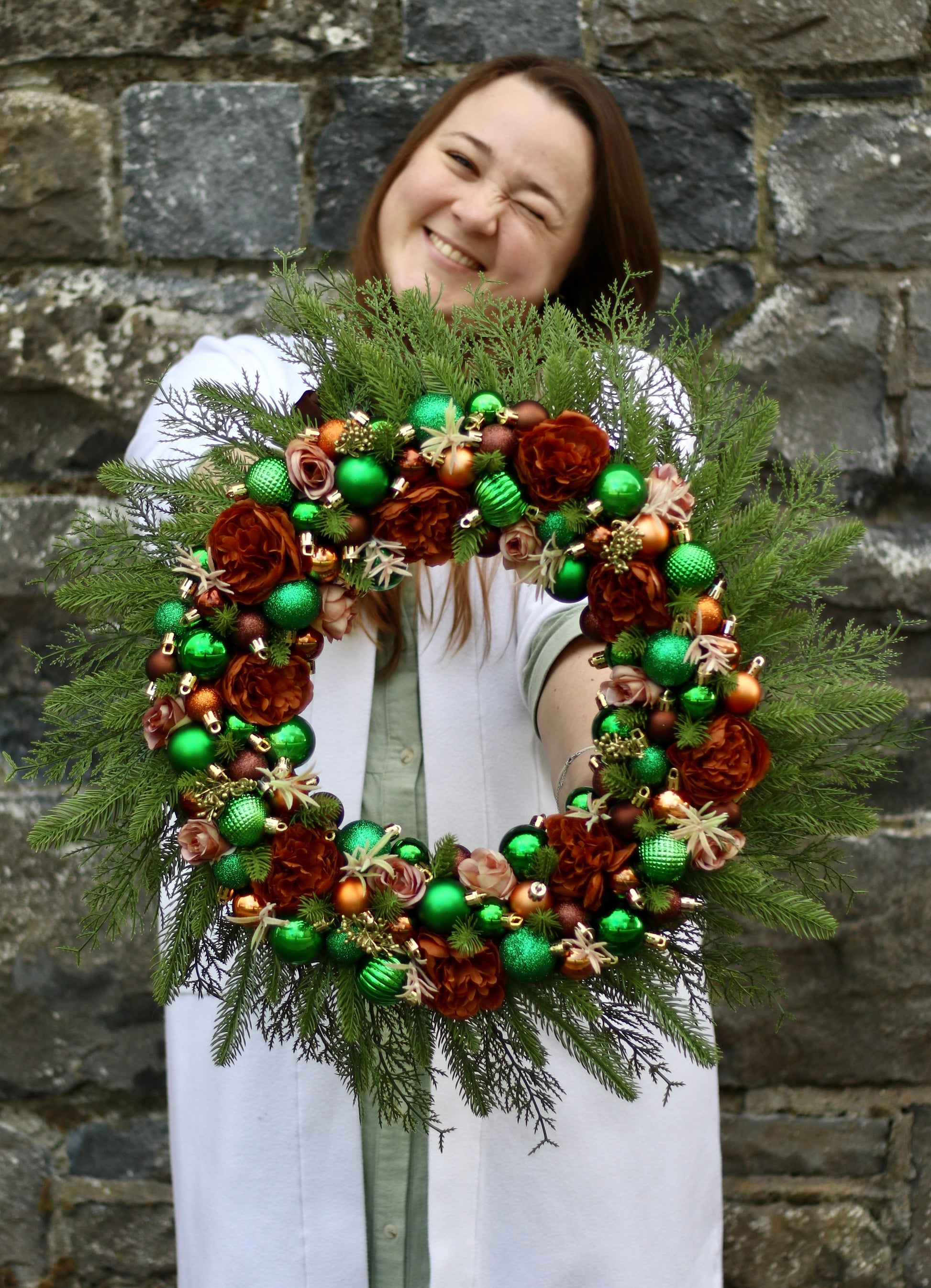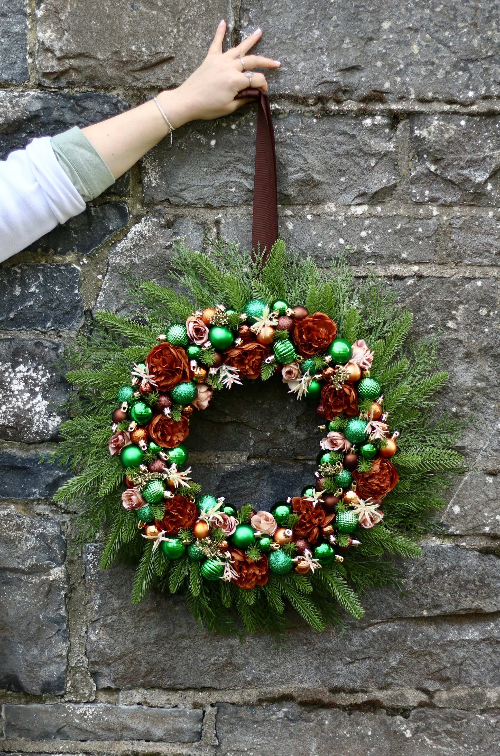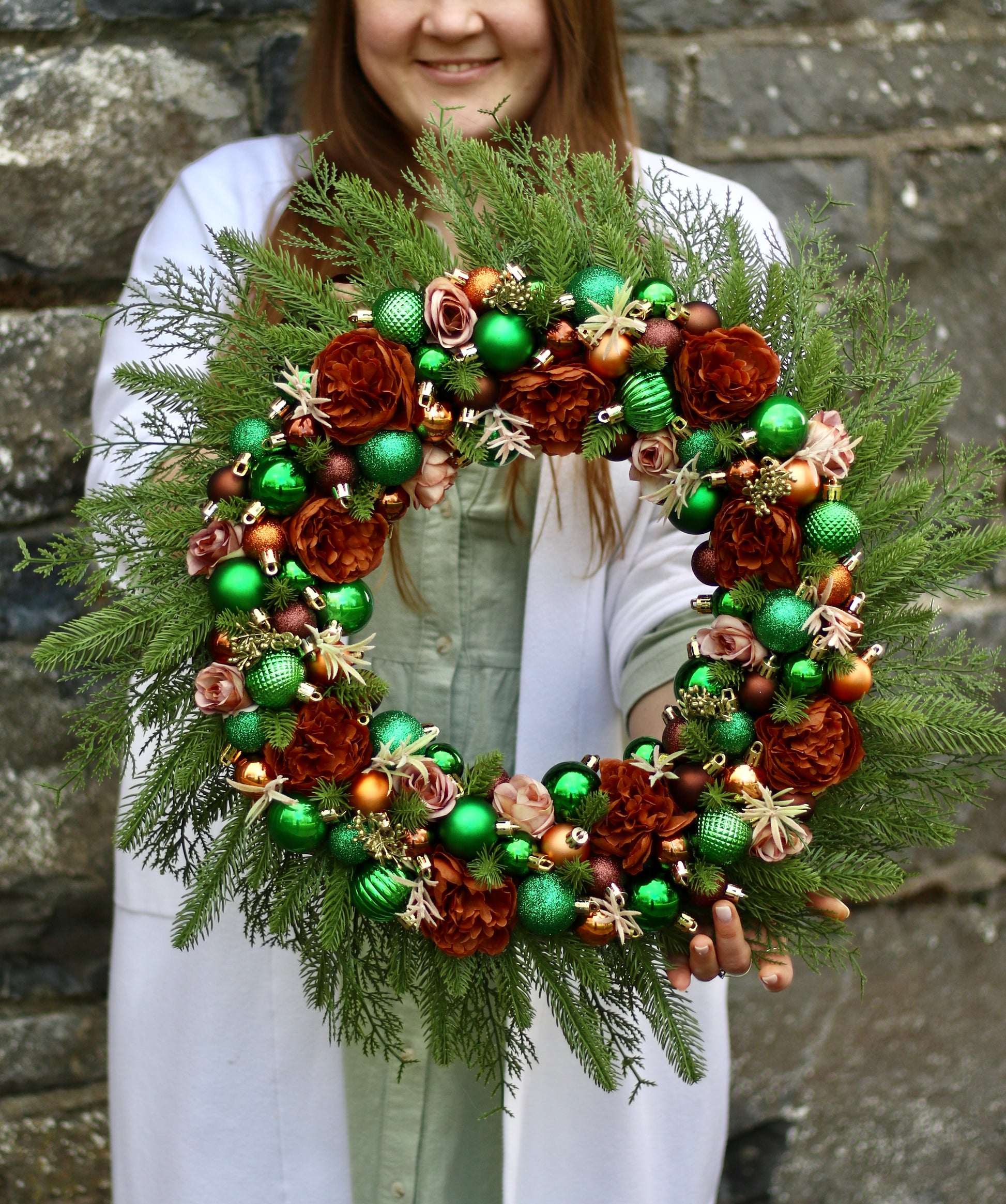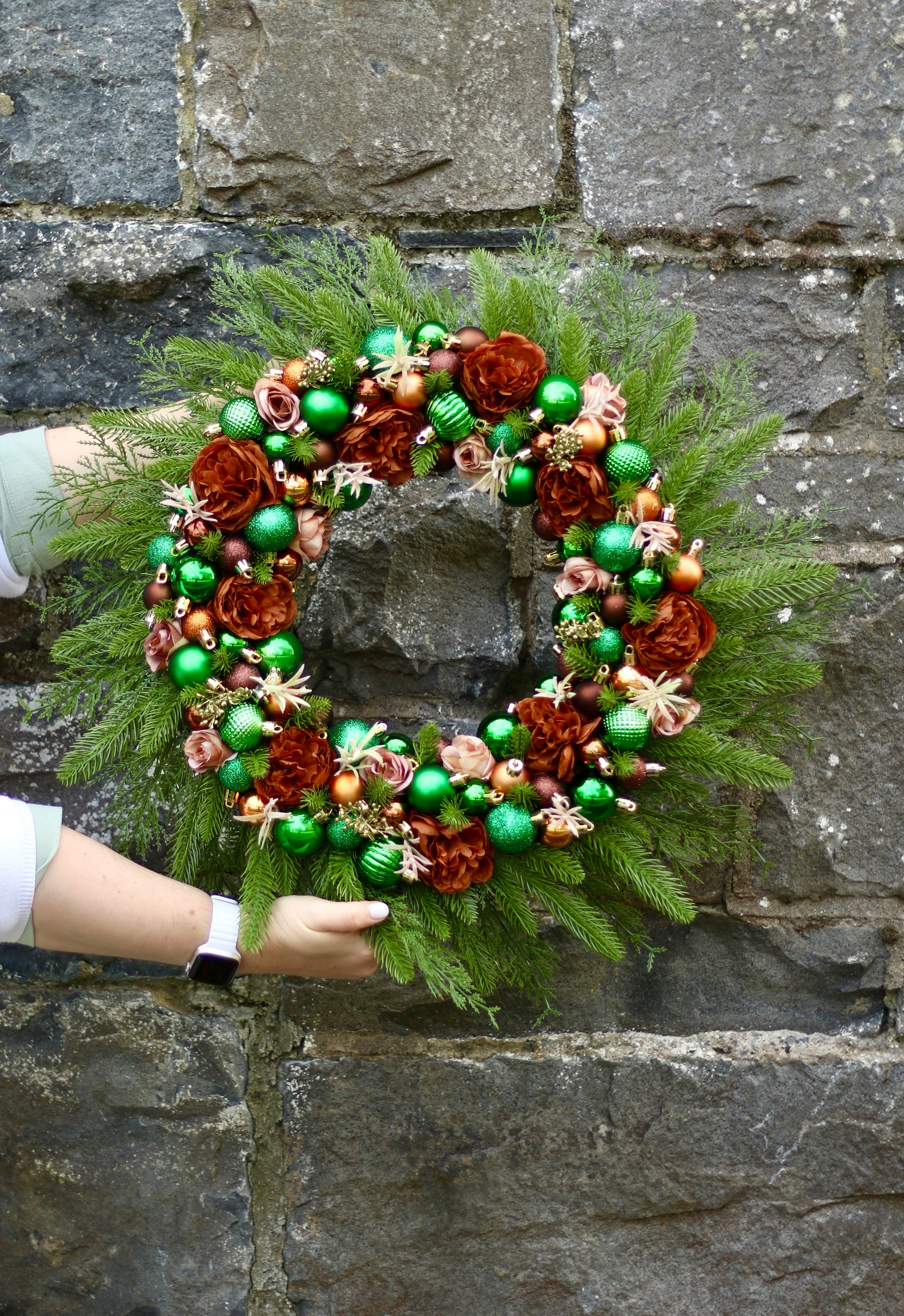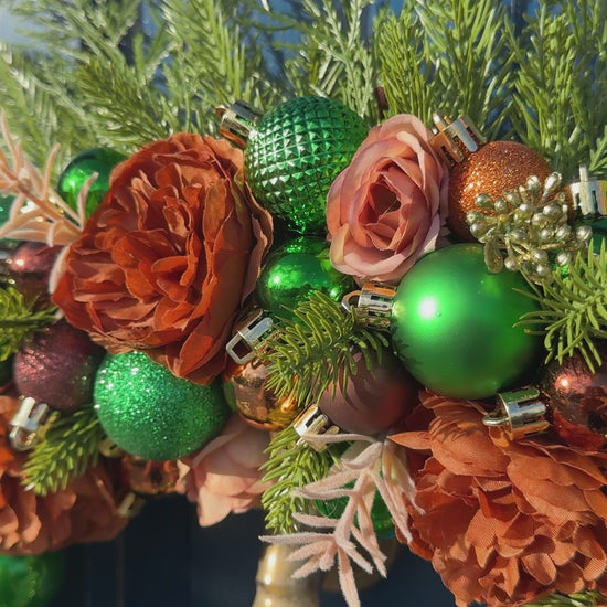 Materials: Artificial greenery and flowers, baubles in green and bronze, festive foliage