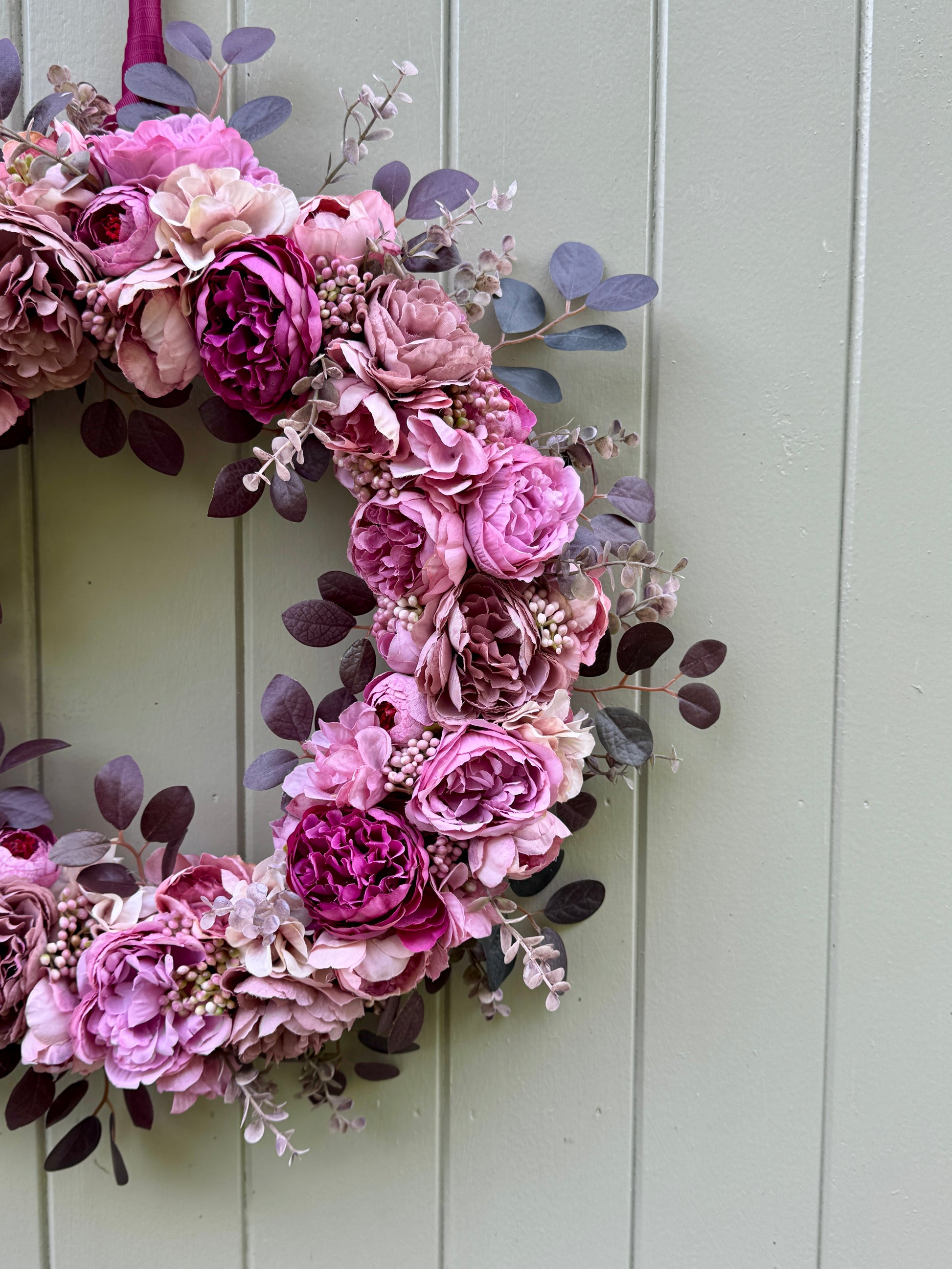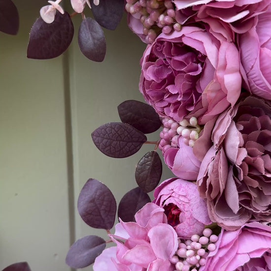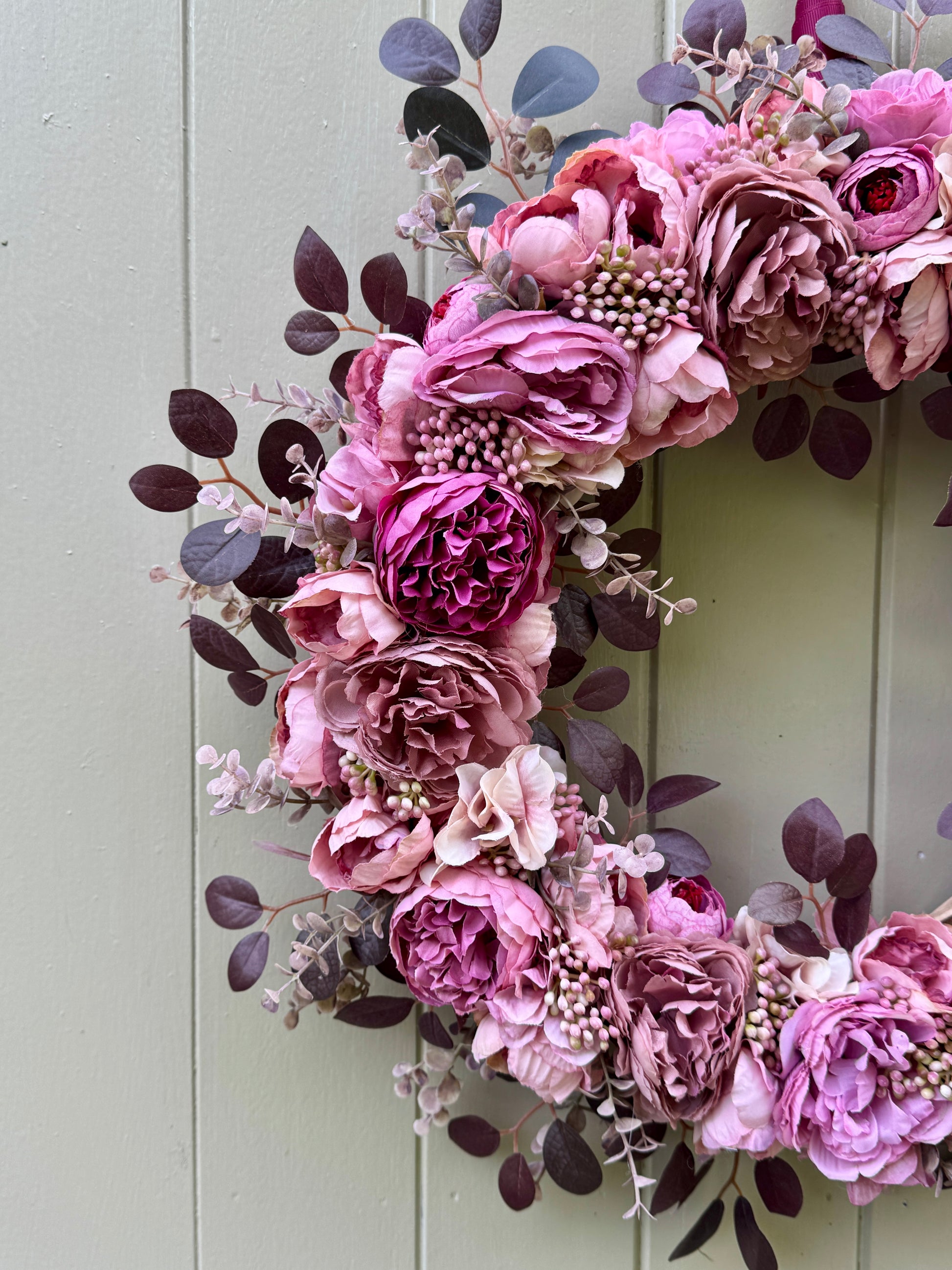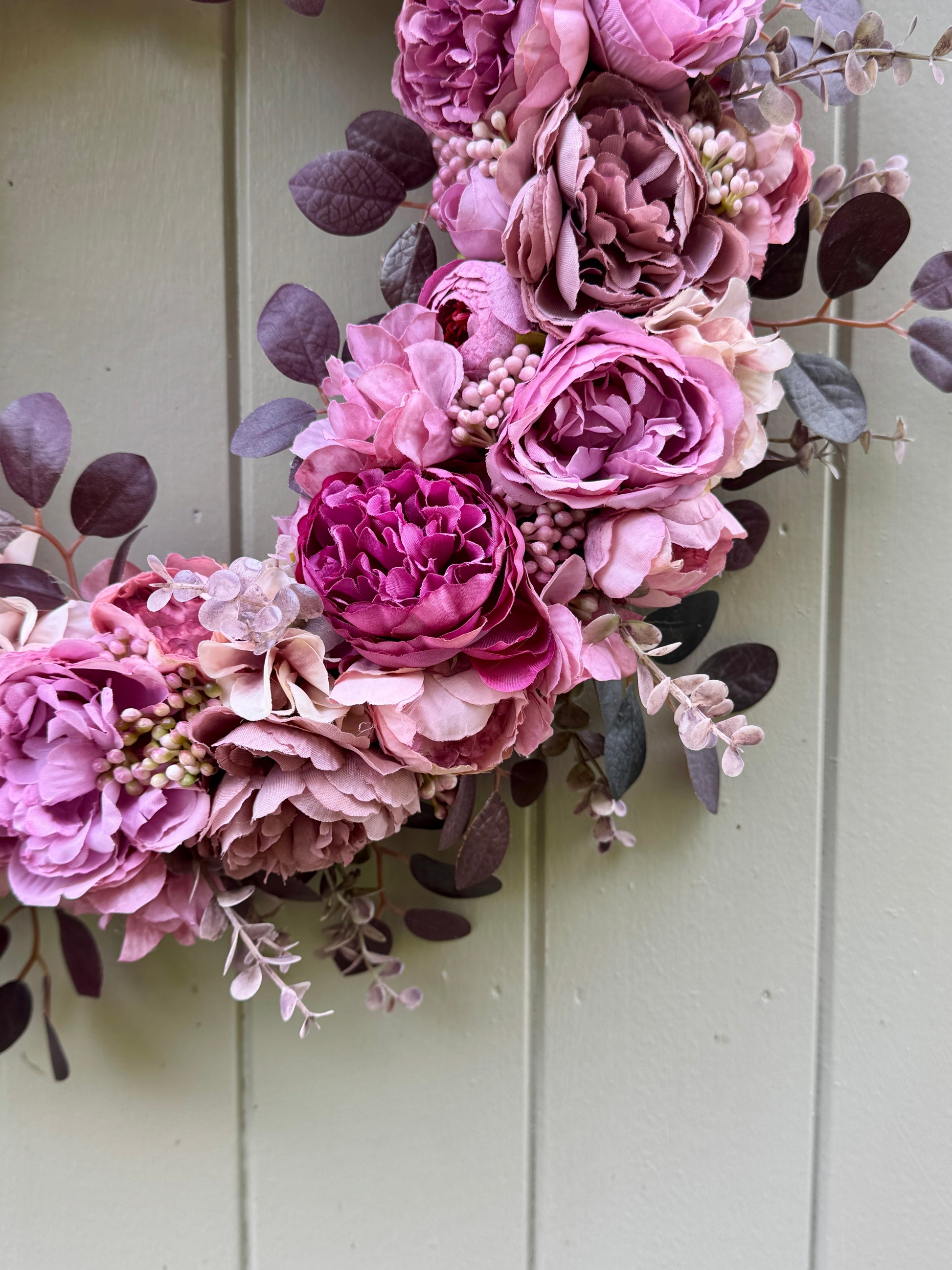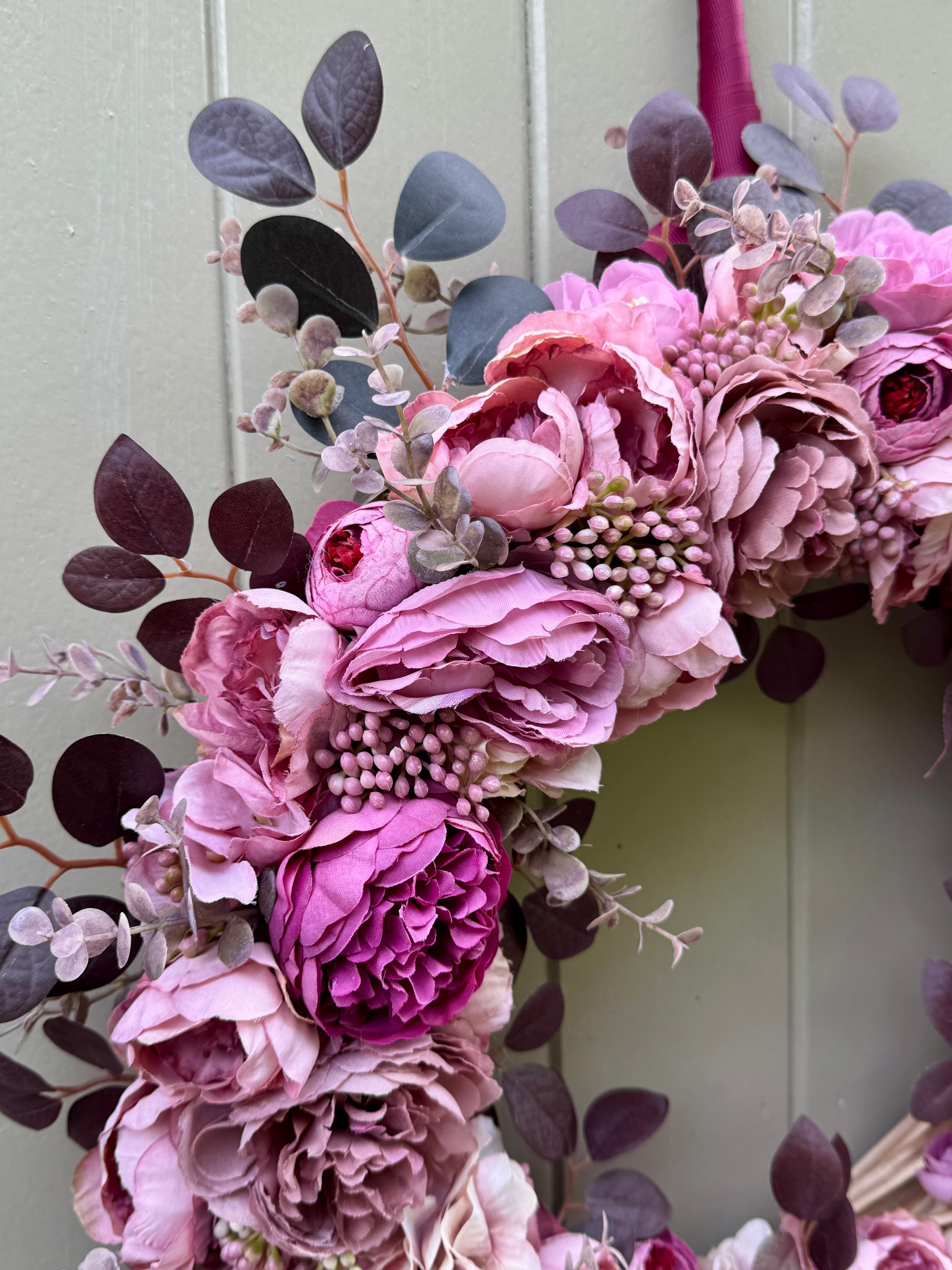 Soft, romantic, and full of charm — this wreath brings together shades of blush pink, dusty mauve, and deep berry tones. Delicate blooms are layered with textured leaves and clusters of soft accents, creating a design that feels both elegant and inviting.