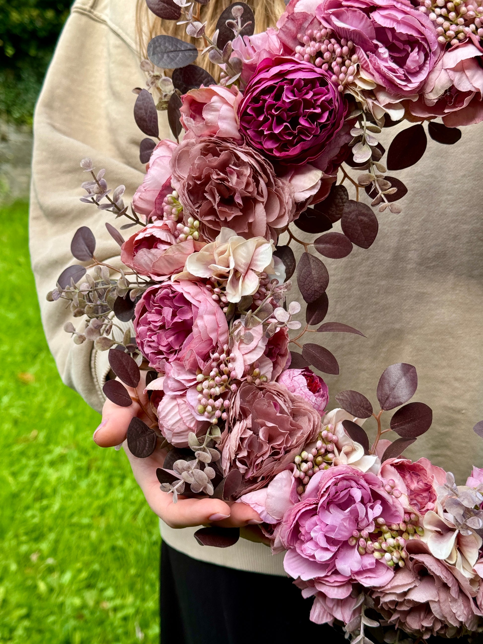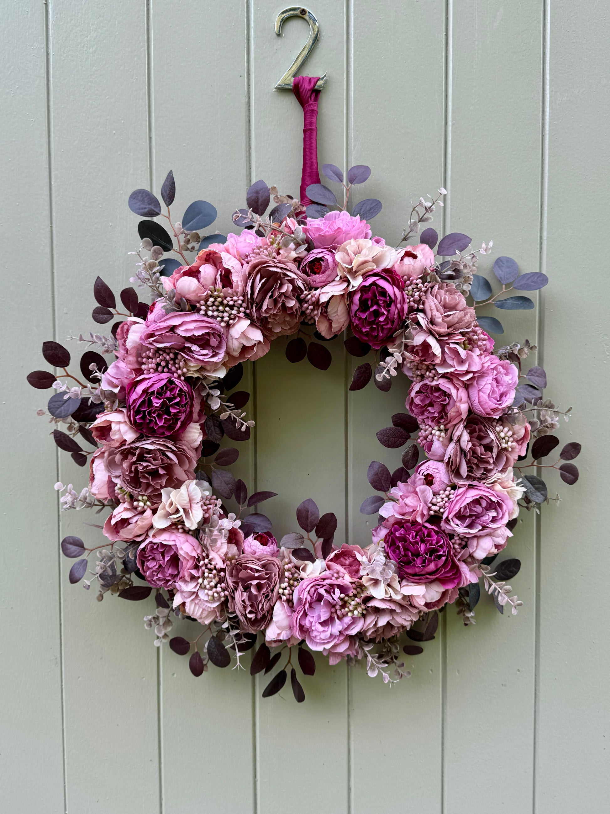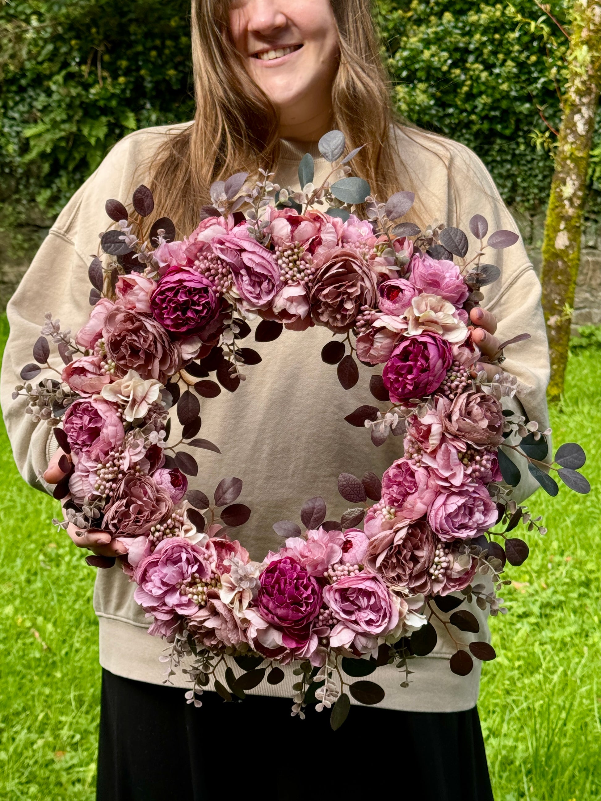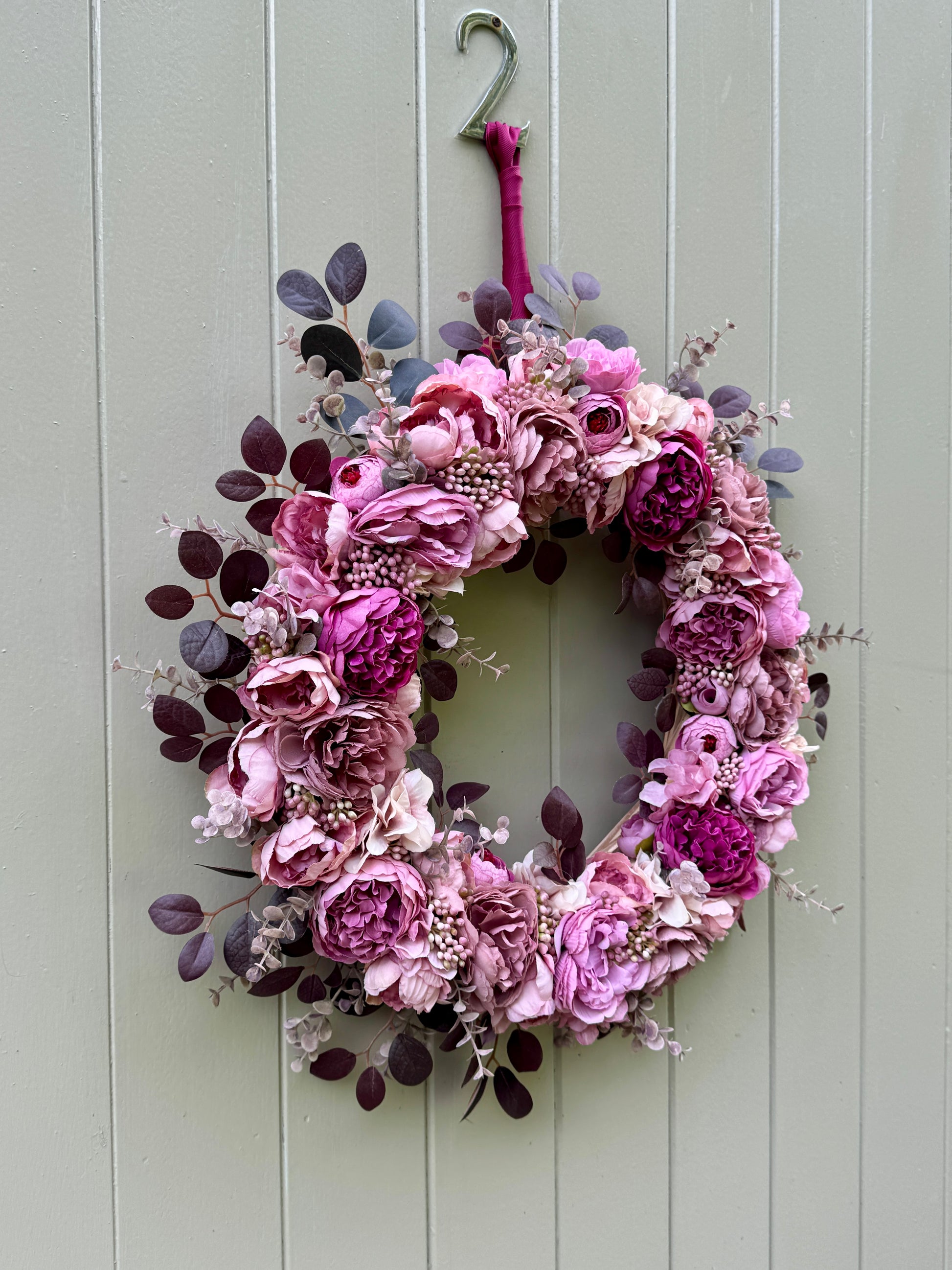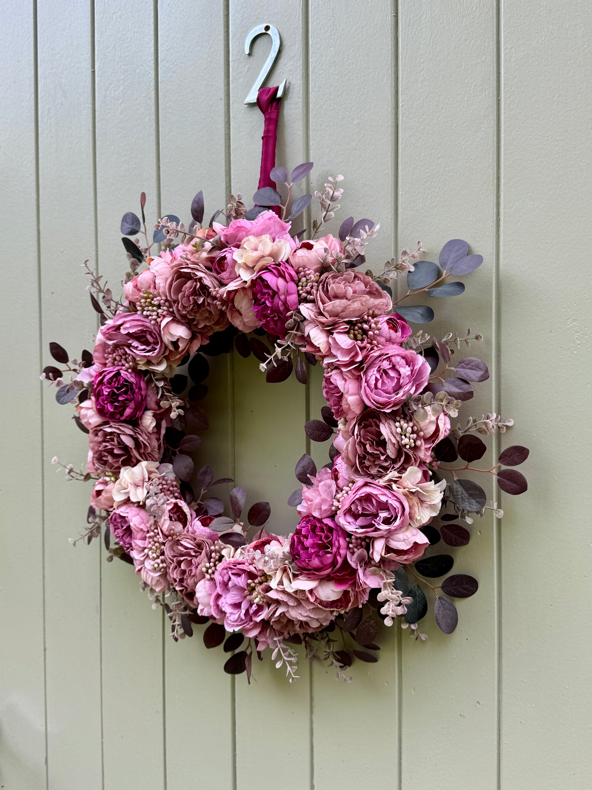 Soft, romantic, and full of charm — this wreath brings together shades of blush pink, dusty mauve, and deep berry tones. Delicate blooms are layered with textured leaves and clusters of soft accents, creating a design that feels both elegant and inviting.