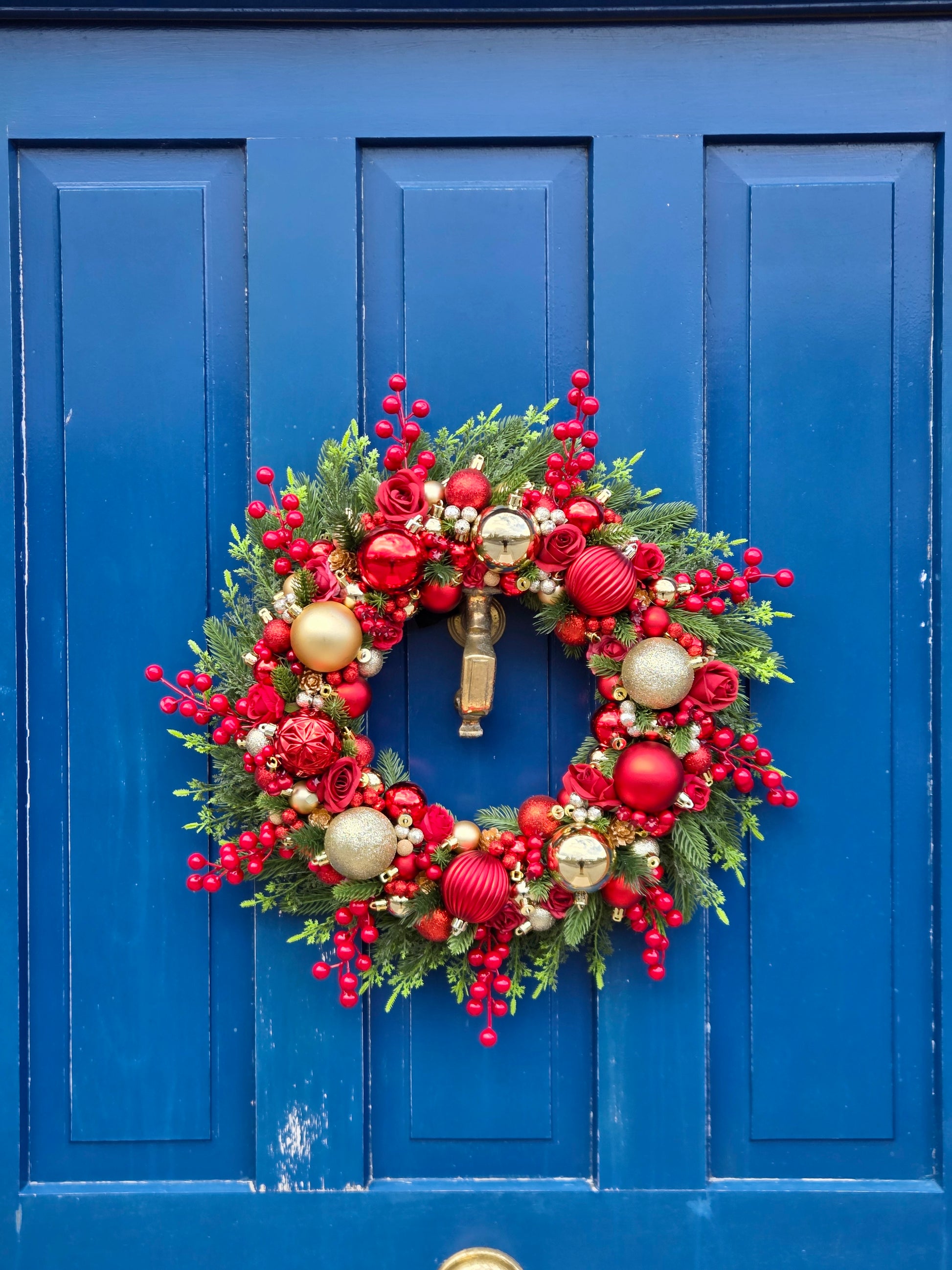 Red and gold ornaments, berries, and evergreens come together in a perfect holiday harmony — vibrant, joyful, and full of sparkle.