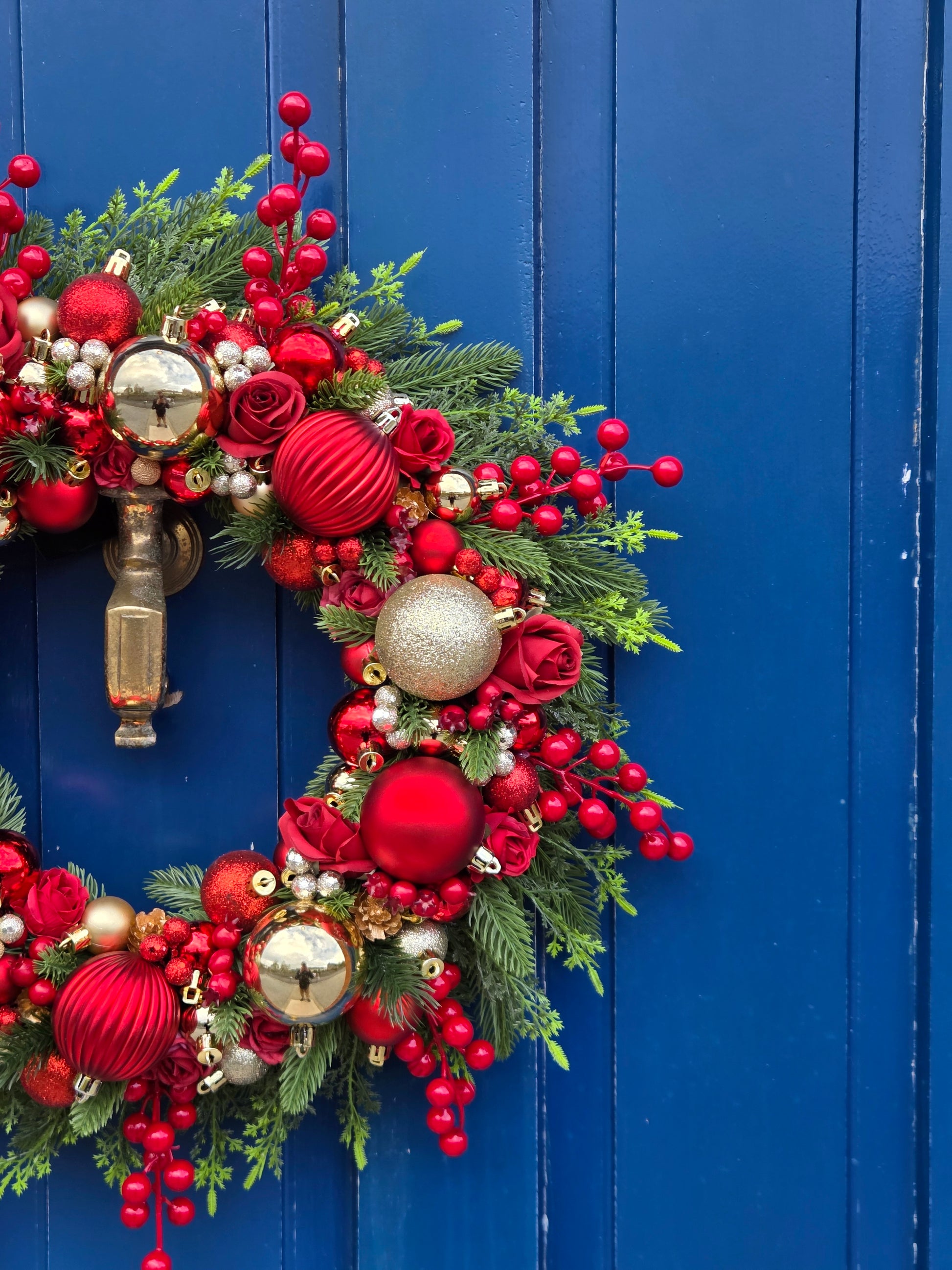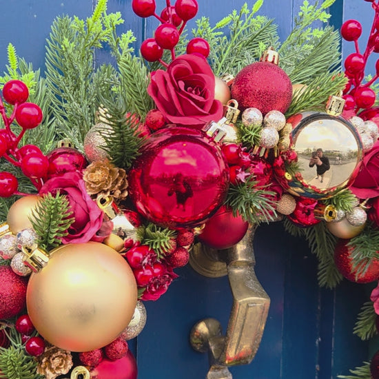 Materials: Artificial fir, Christmas baubles (red & gold), berries, roses, decorative accents