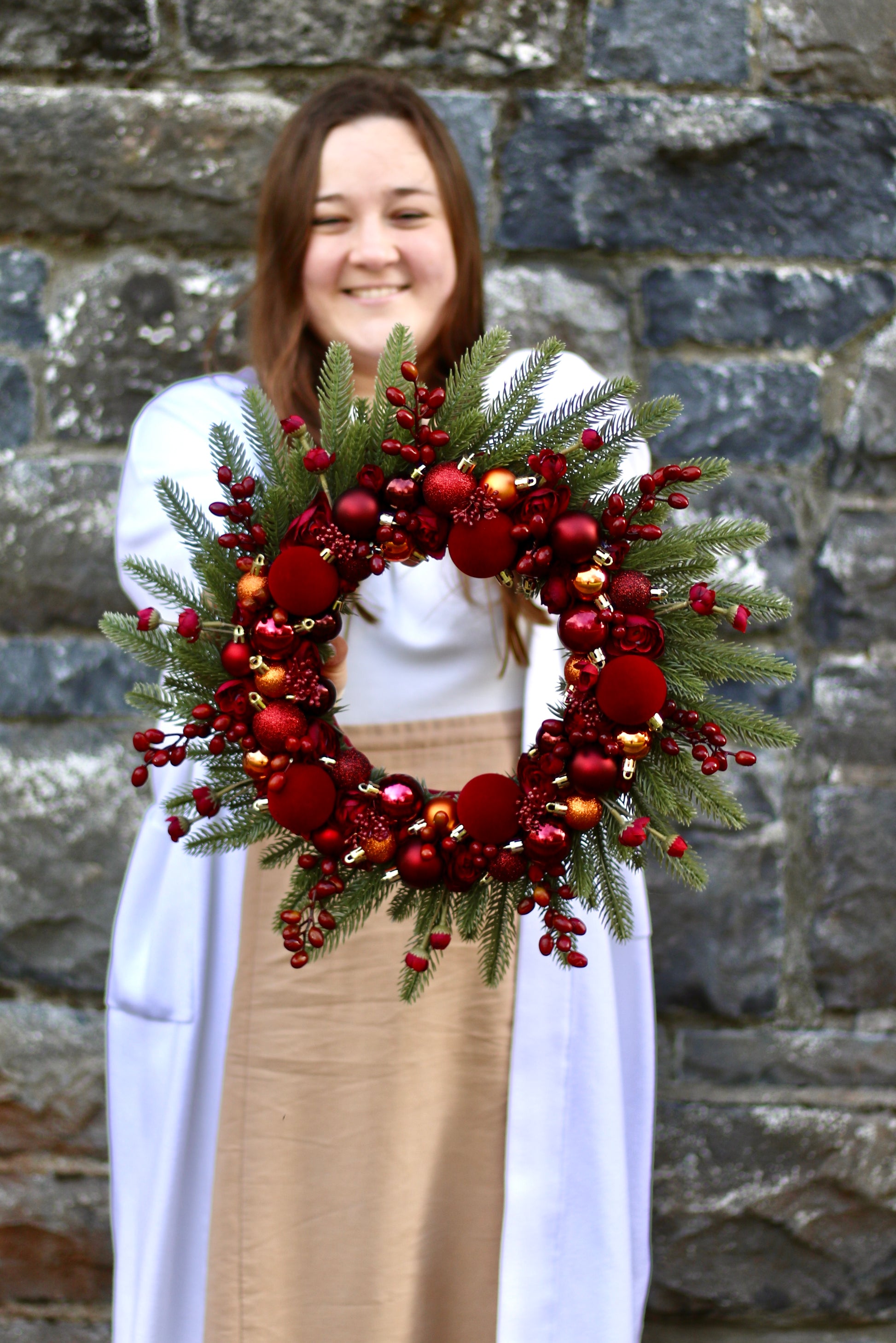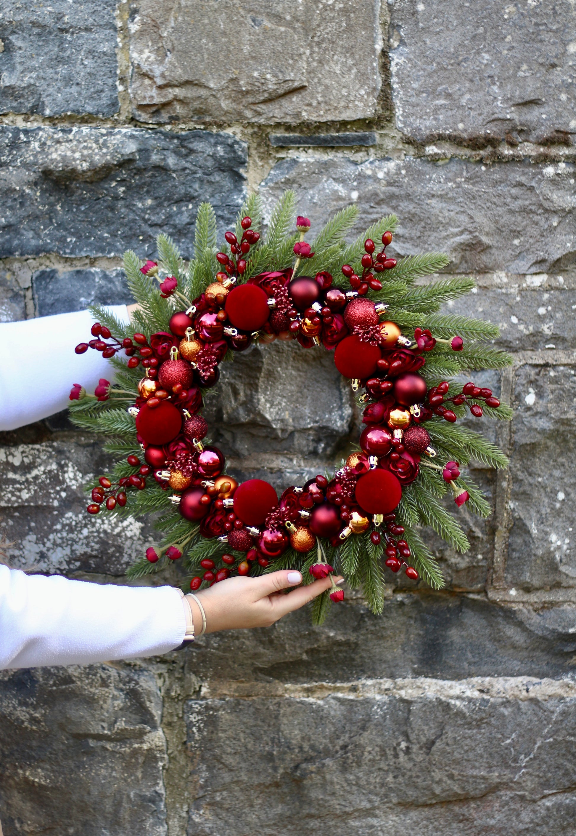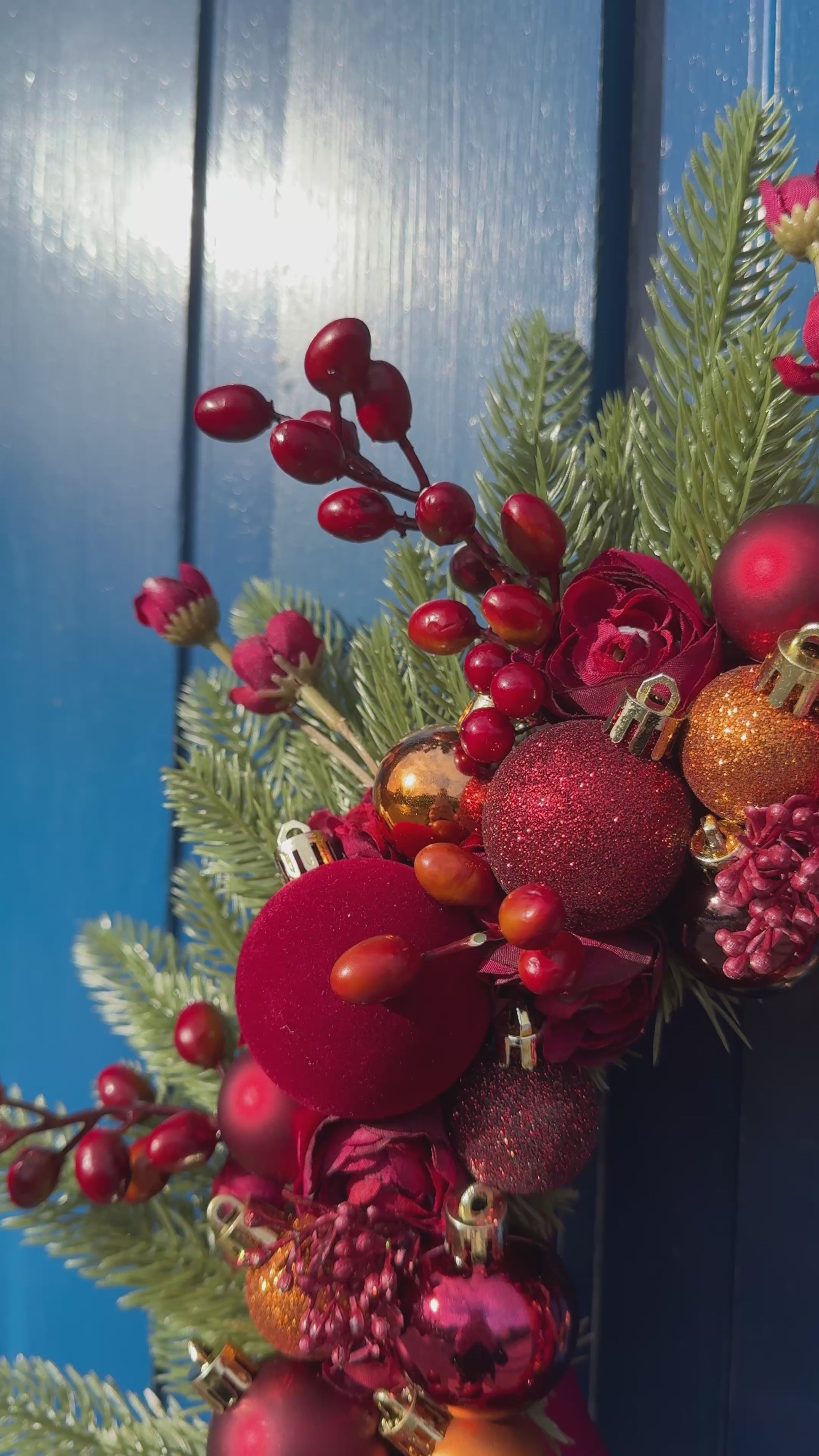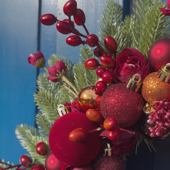 Materials: Artificial fir, velvet ornaments, Christmas baubles, berries, flowers, golden accents