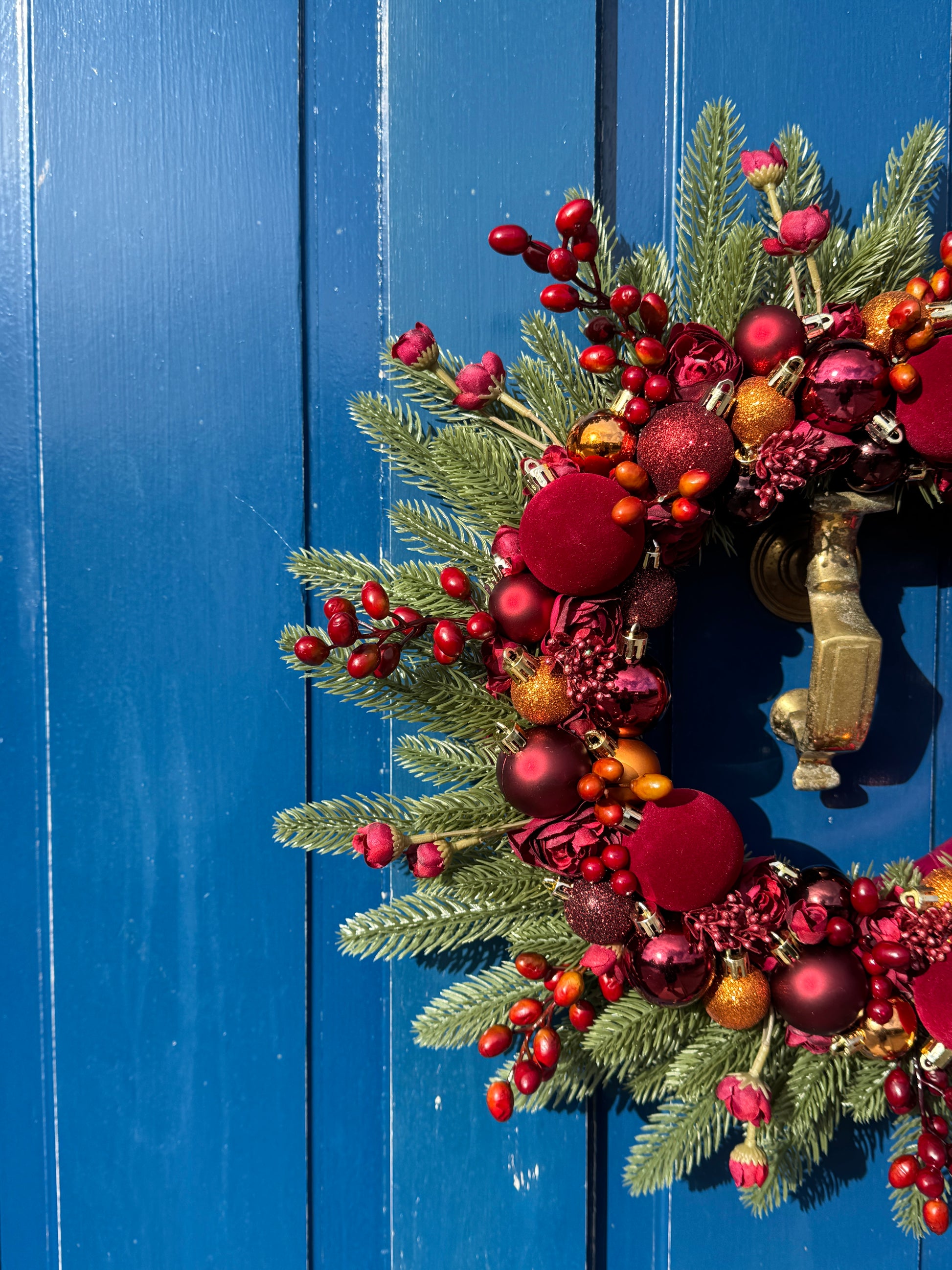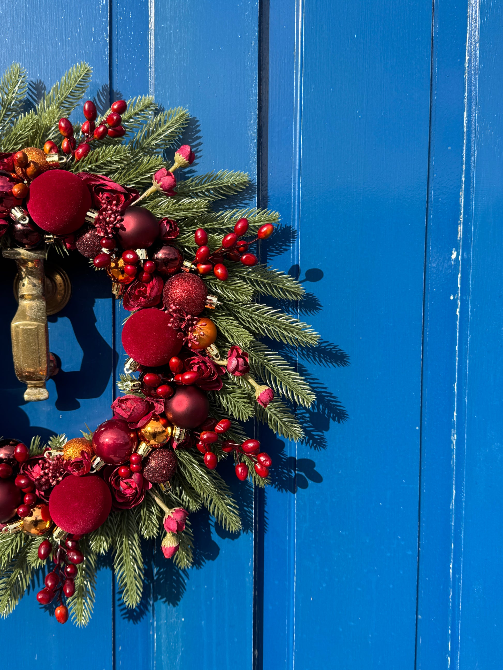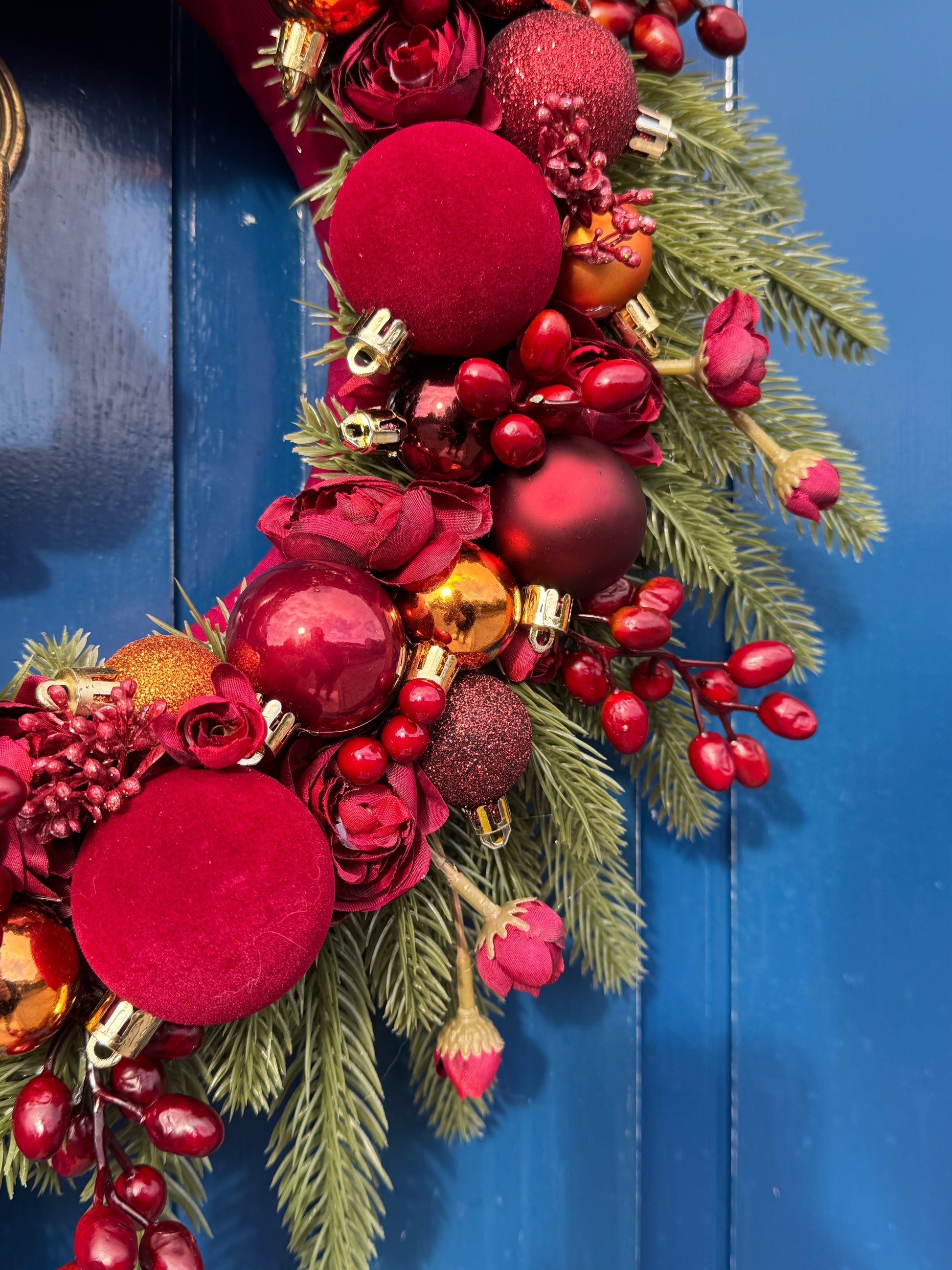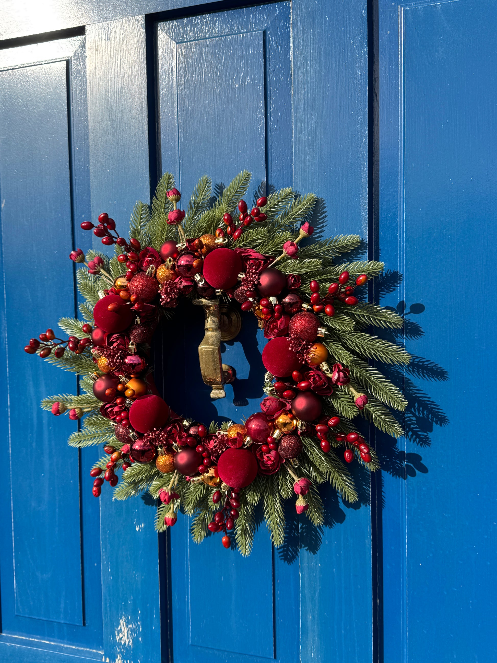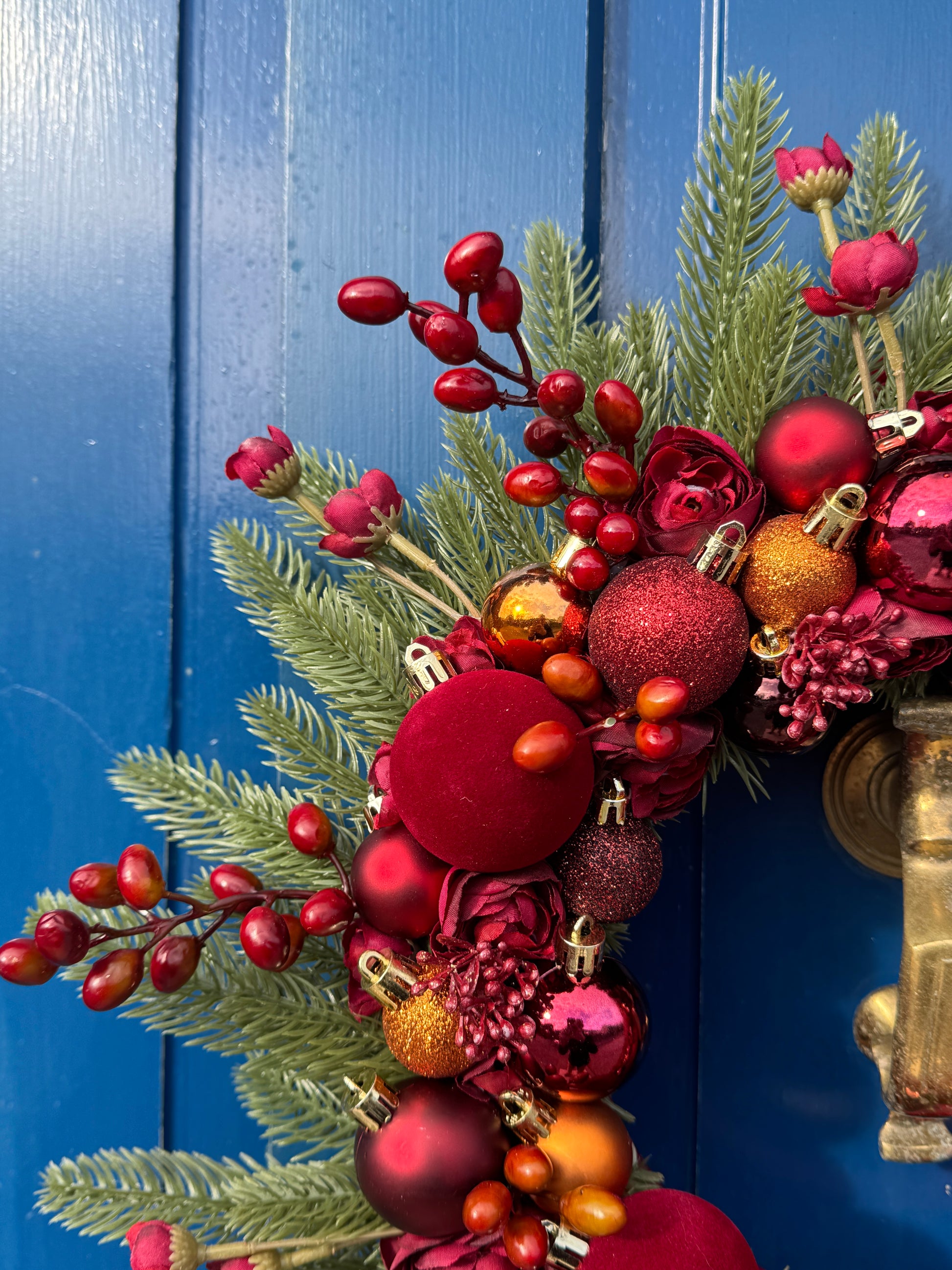 A wreath that looks like Christmas warmth itself — deep reds, soft greens and a touch of gold shimmer, just like the glow of mulled wine by candlelight.
