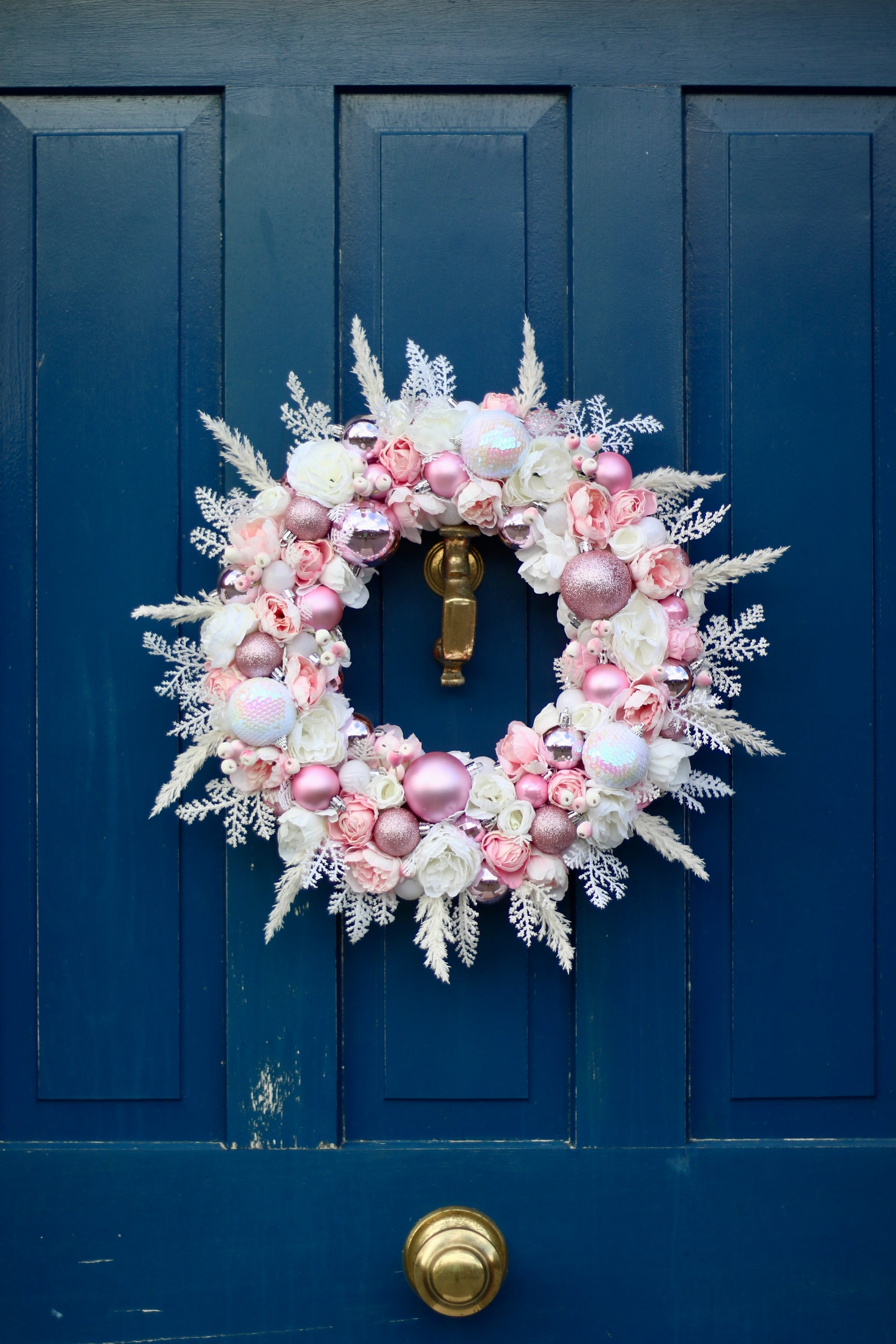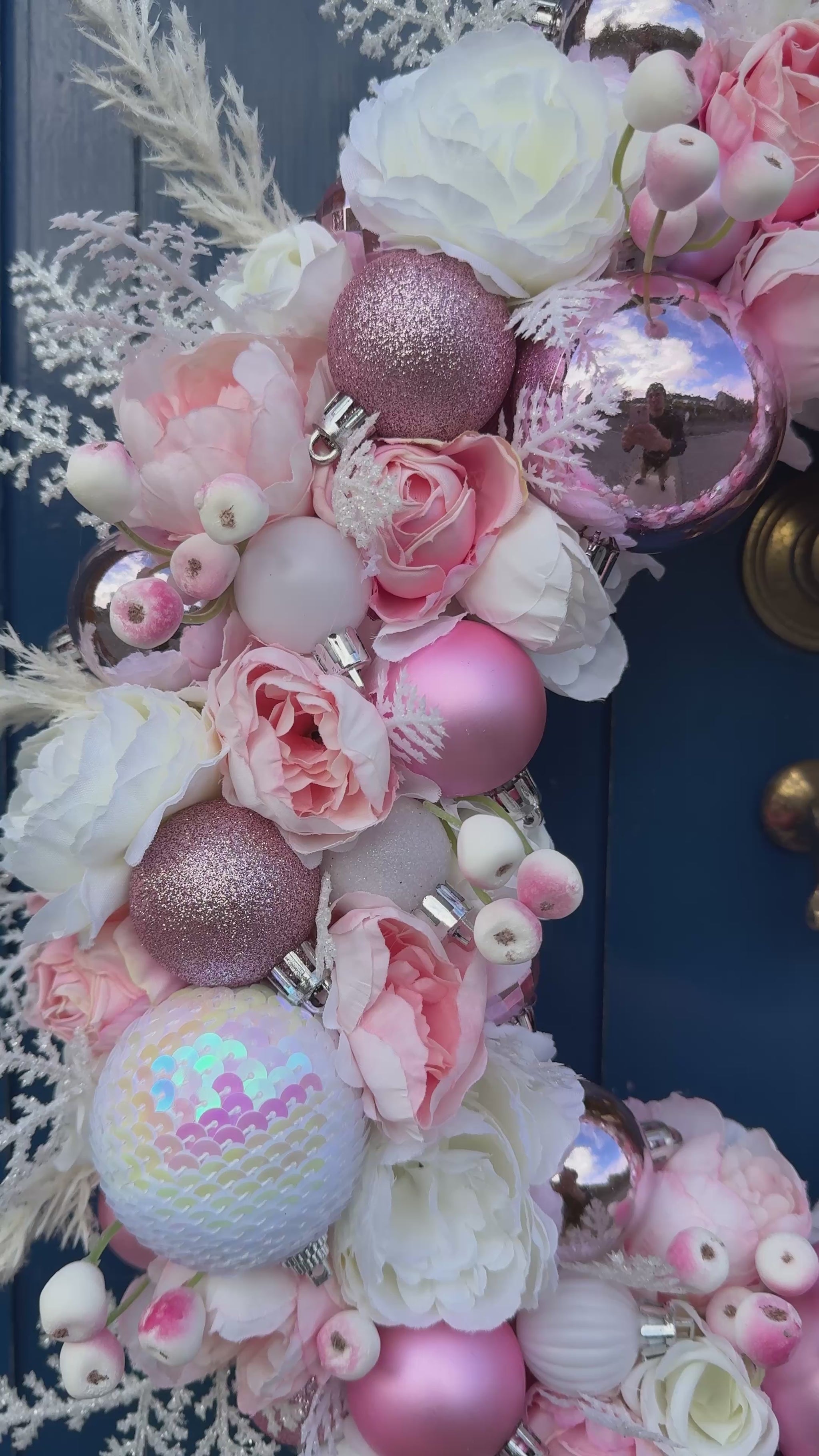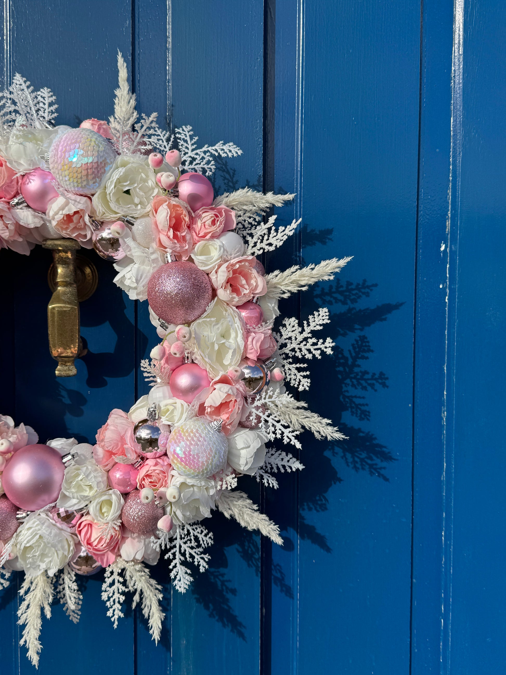 Blush pink ornaments, white blooms, and a hint of shimmer create a look that’s both magical and modern. It’s the kind of wreath that makes you smile every time you open the door — gentle, bright, and full of joy.