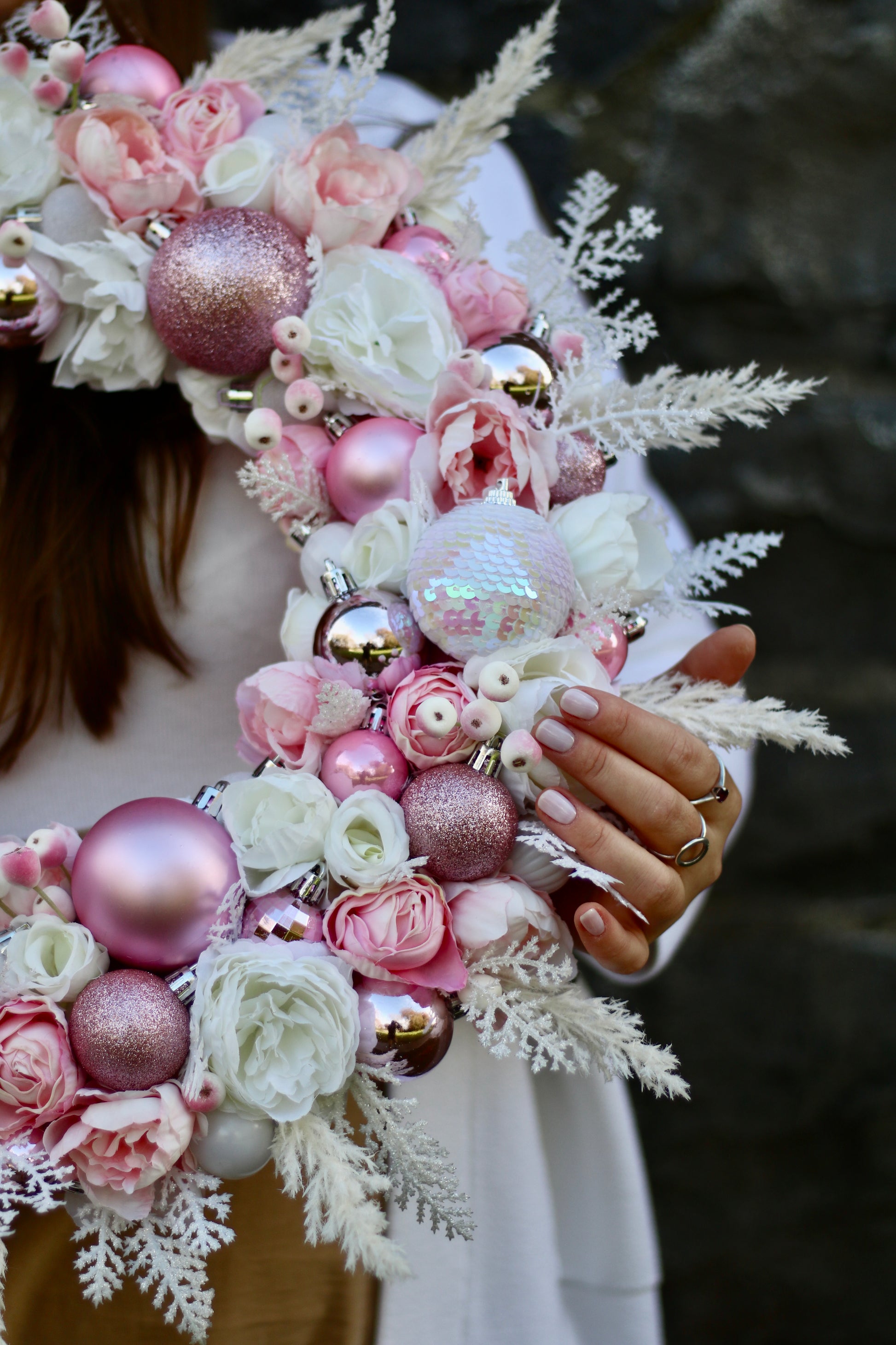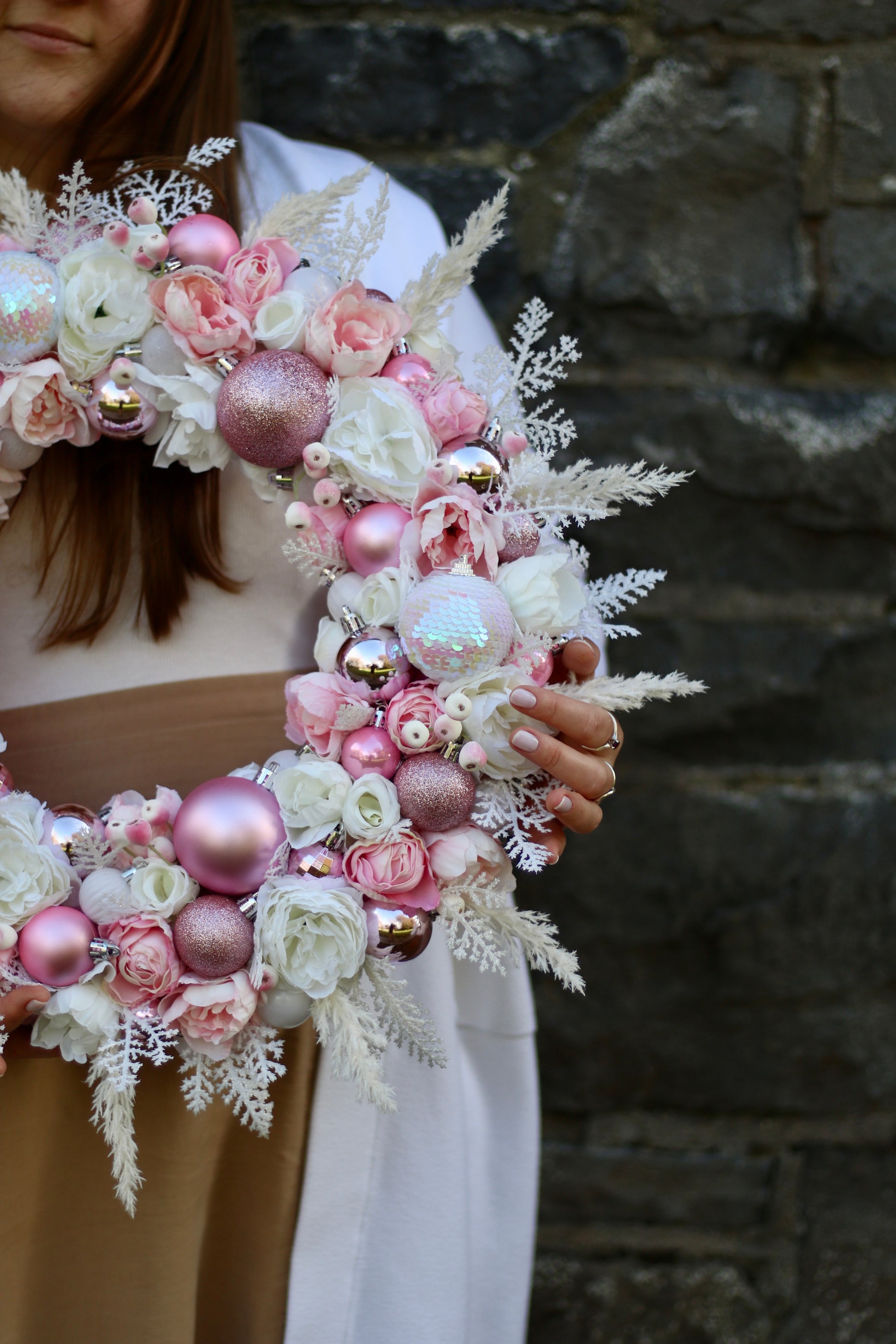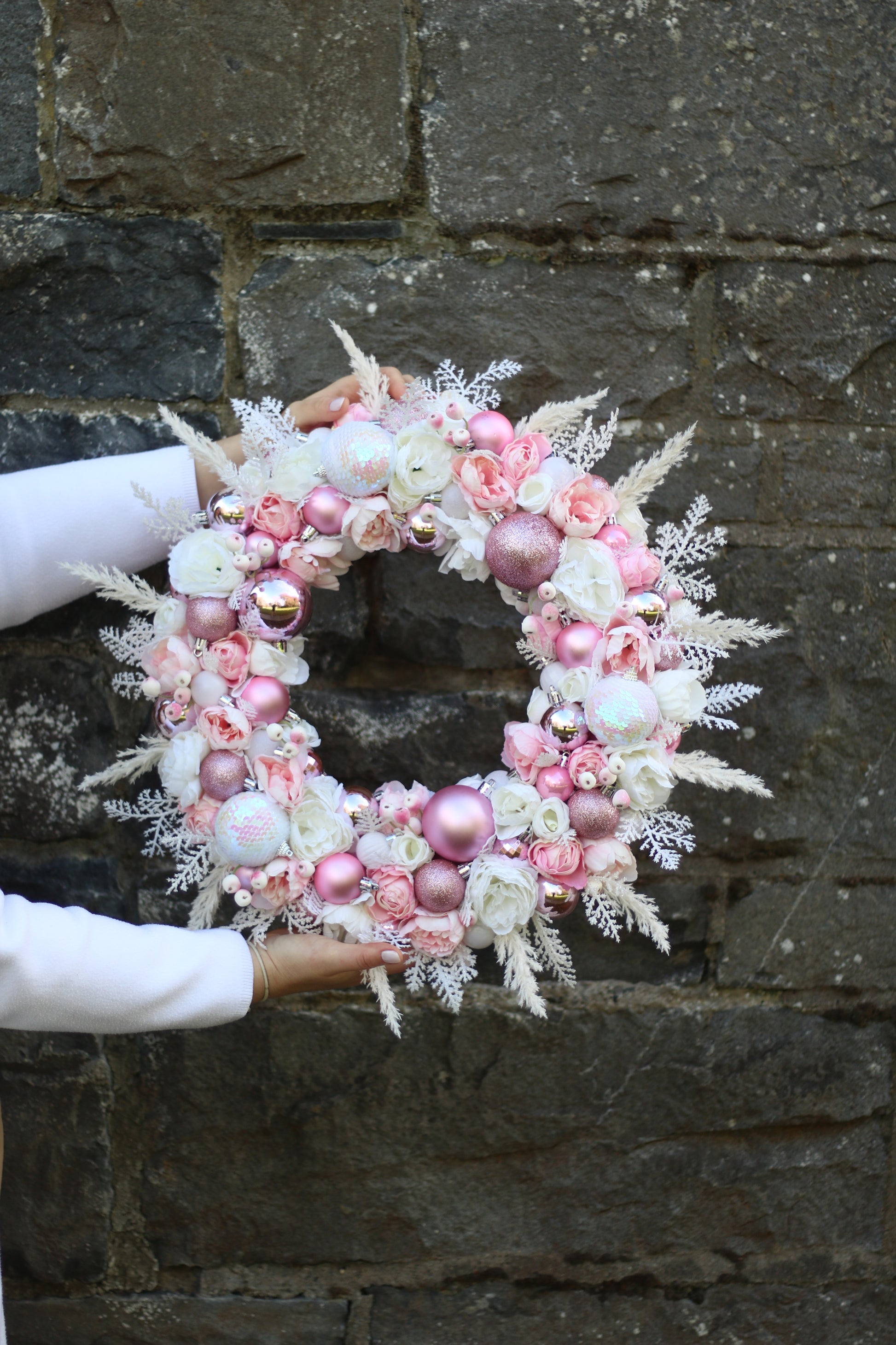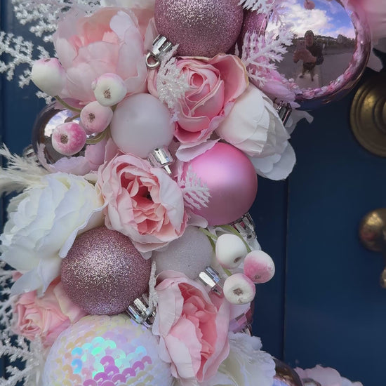 Blush pink ornaments, white blooms, and a hint of shimmer create a look that’s both magical and modern. It’s the kind of wreath that makes you smile every time you open the door — gentle, bright, and full of joy.