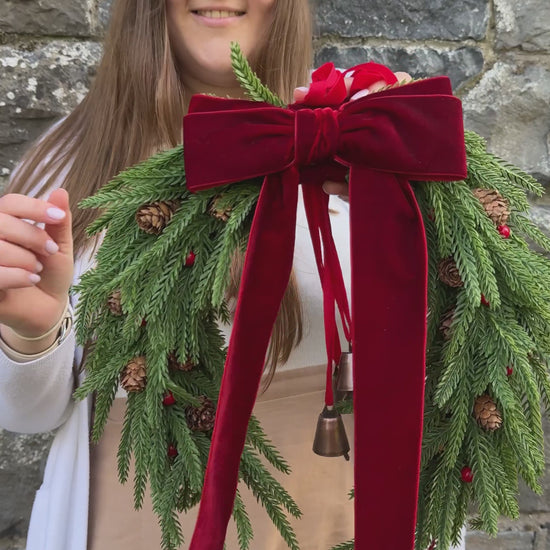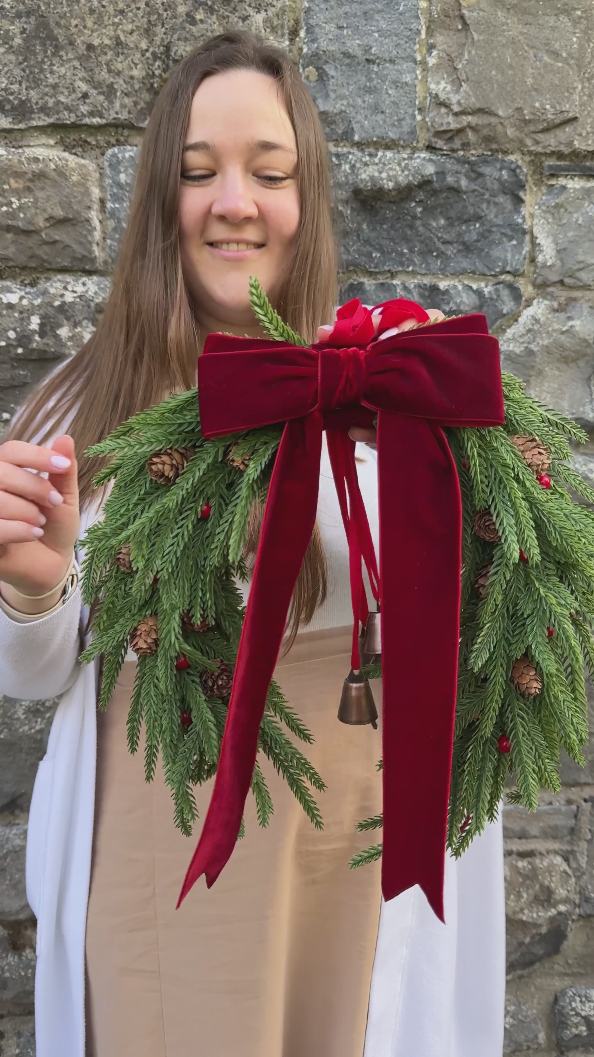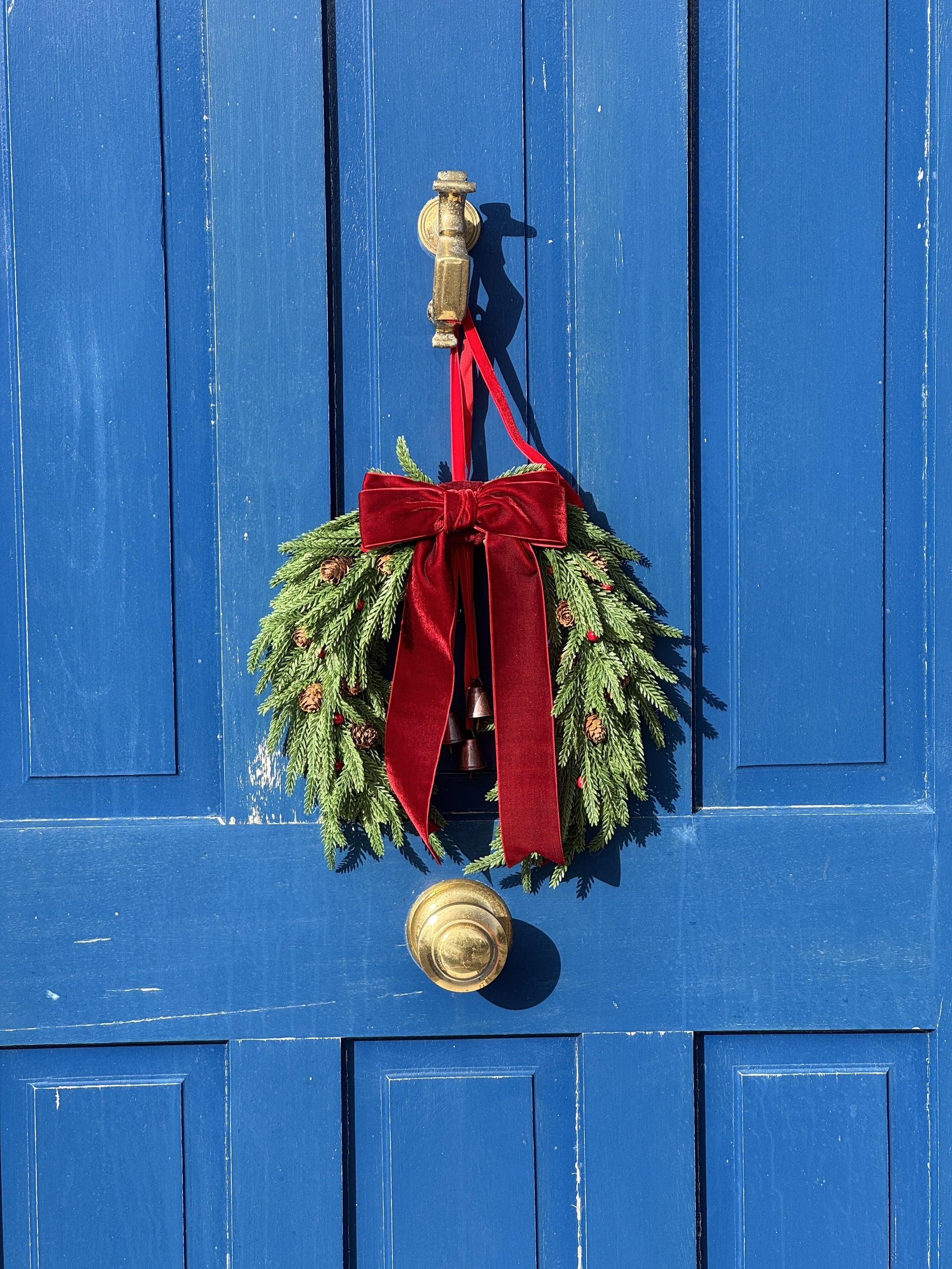 There’s something timeless about this wreath — the deep red velvet bow, the gentle ring of tiny bells, and the touch of pinecones and berries that make it feel straight out of a Christmas storybook.