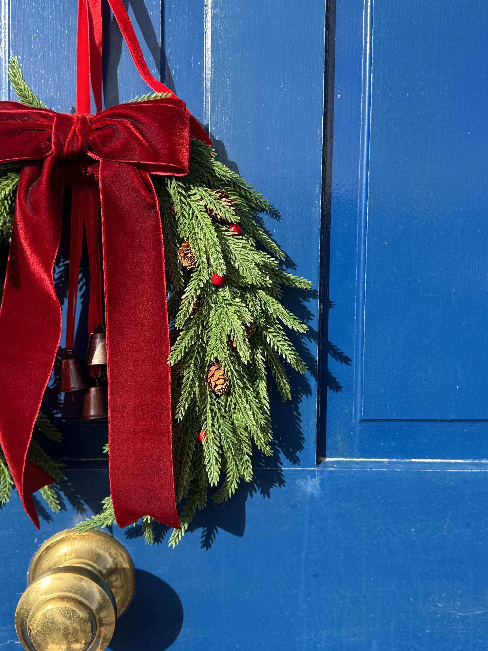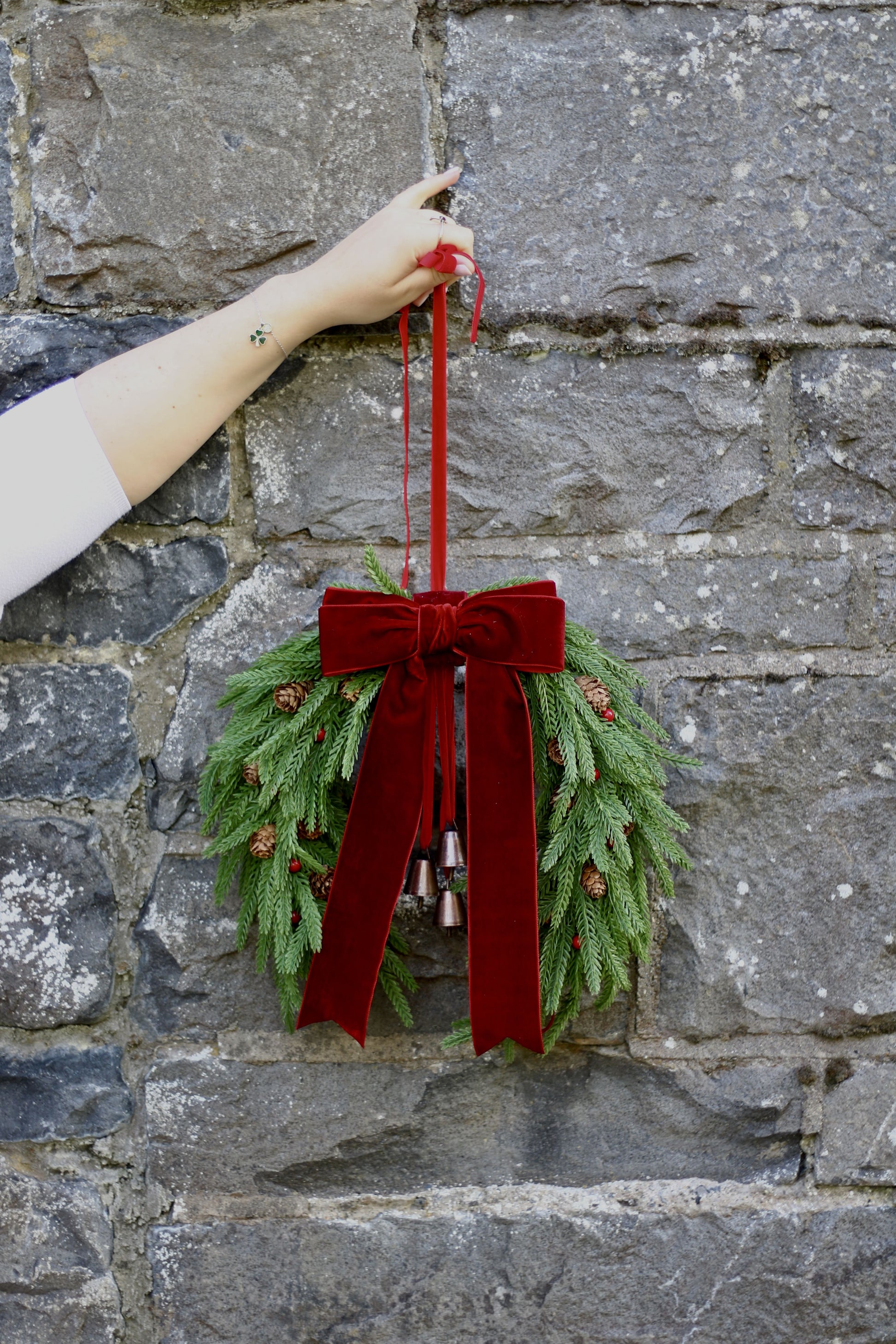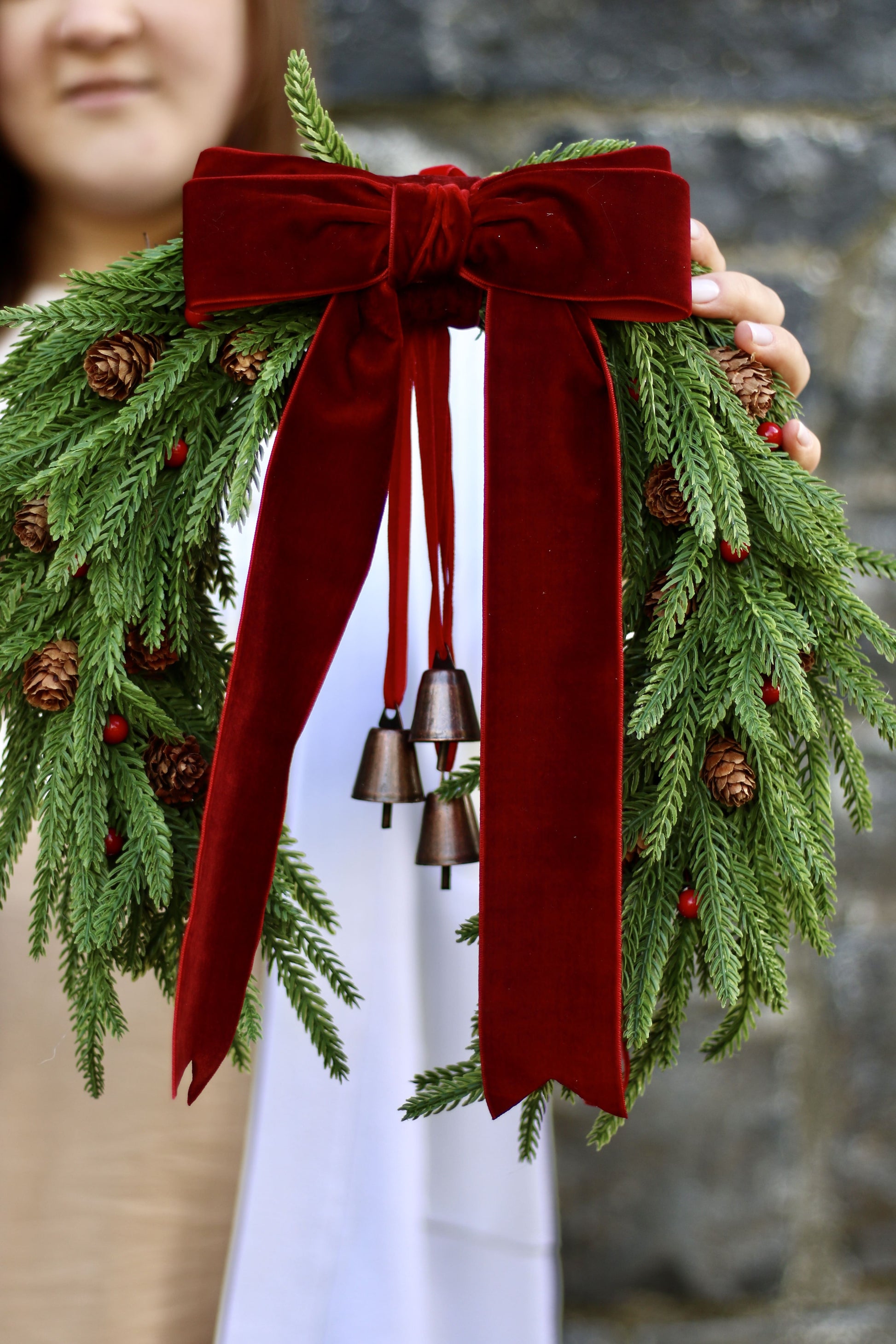 There’s something timeless about this wreath — the deep red velvet bow, the gentle ring of tiny bells, and the touch of pinecones and berries that make it feel straight out of a Christmas storybook.