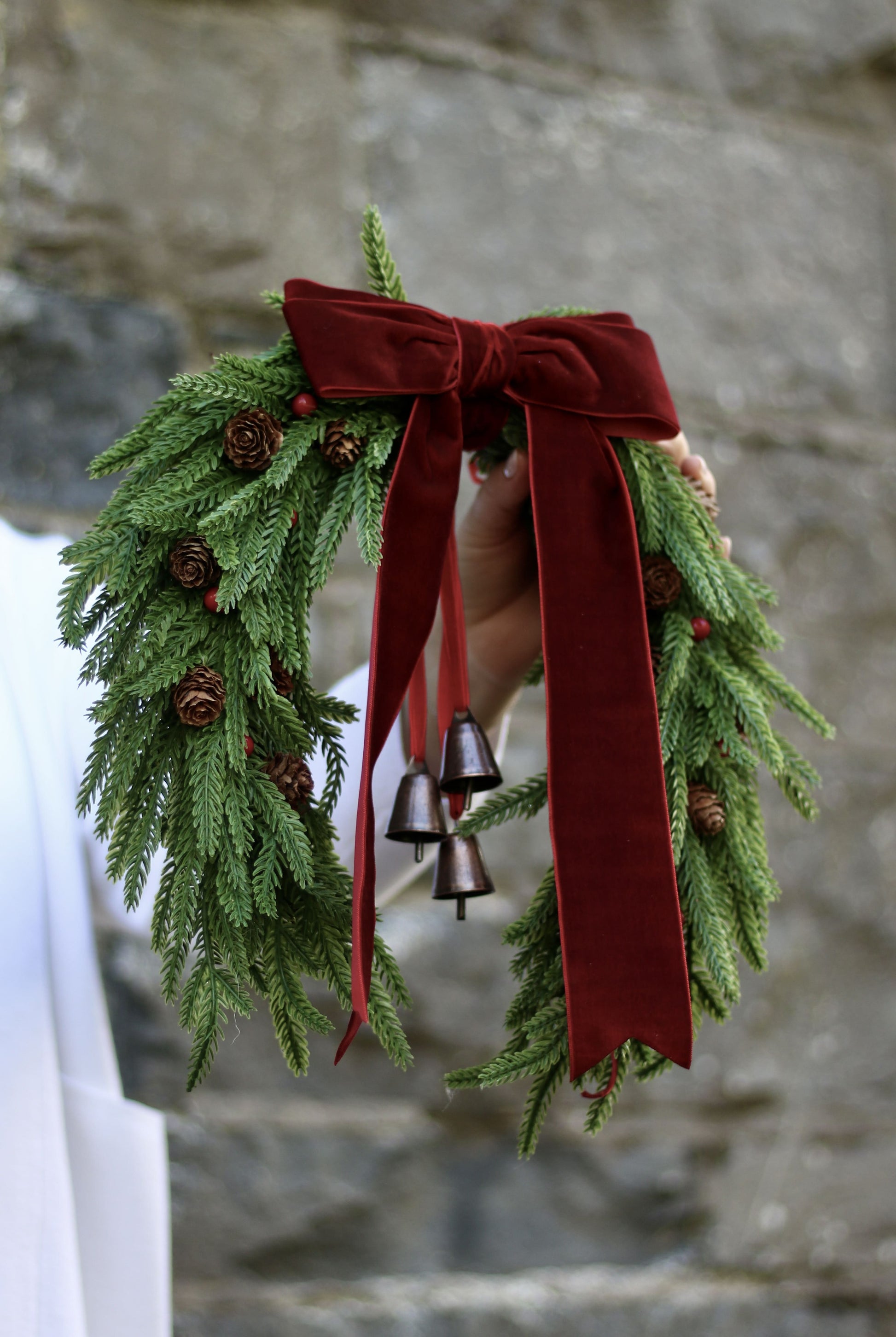 Materials: Artificial pine, velvet ribbon, metal bells, pinecones, red berries