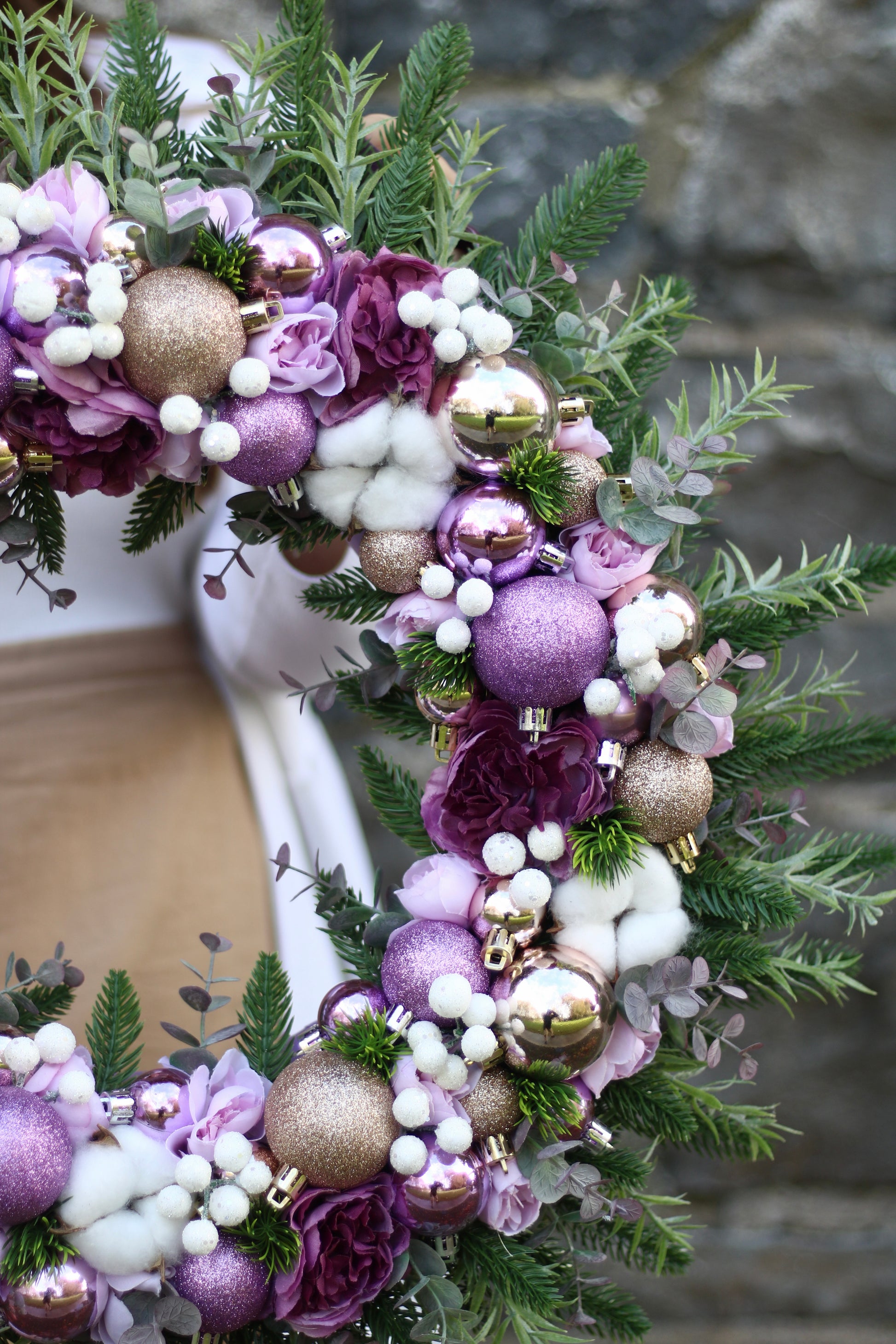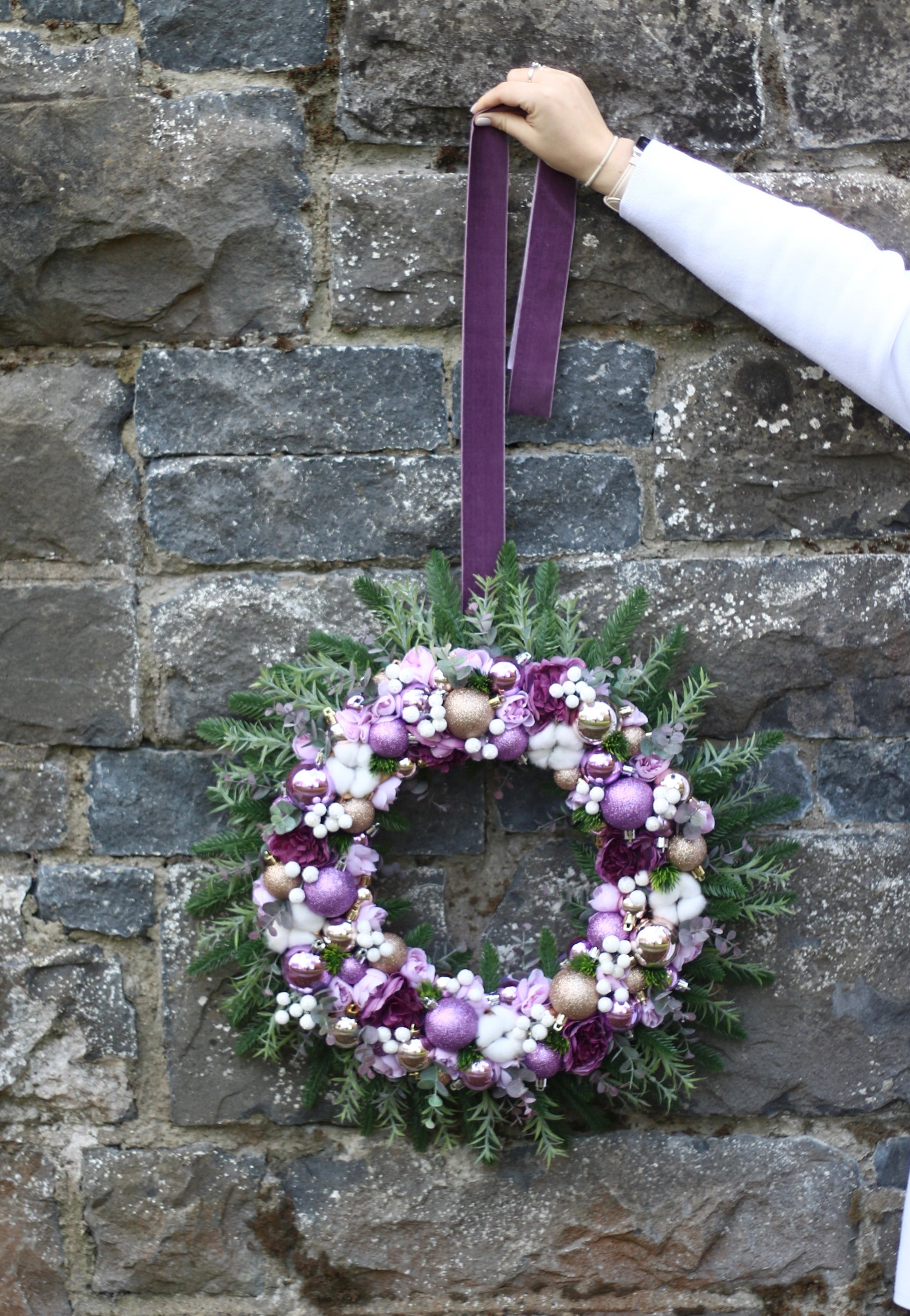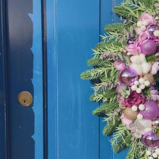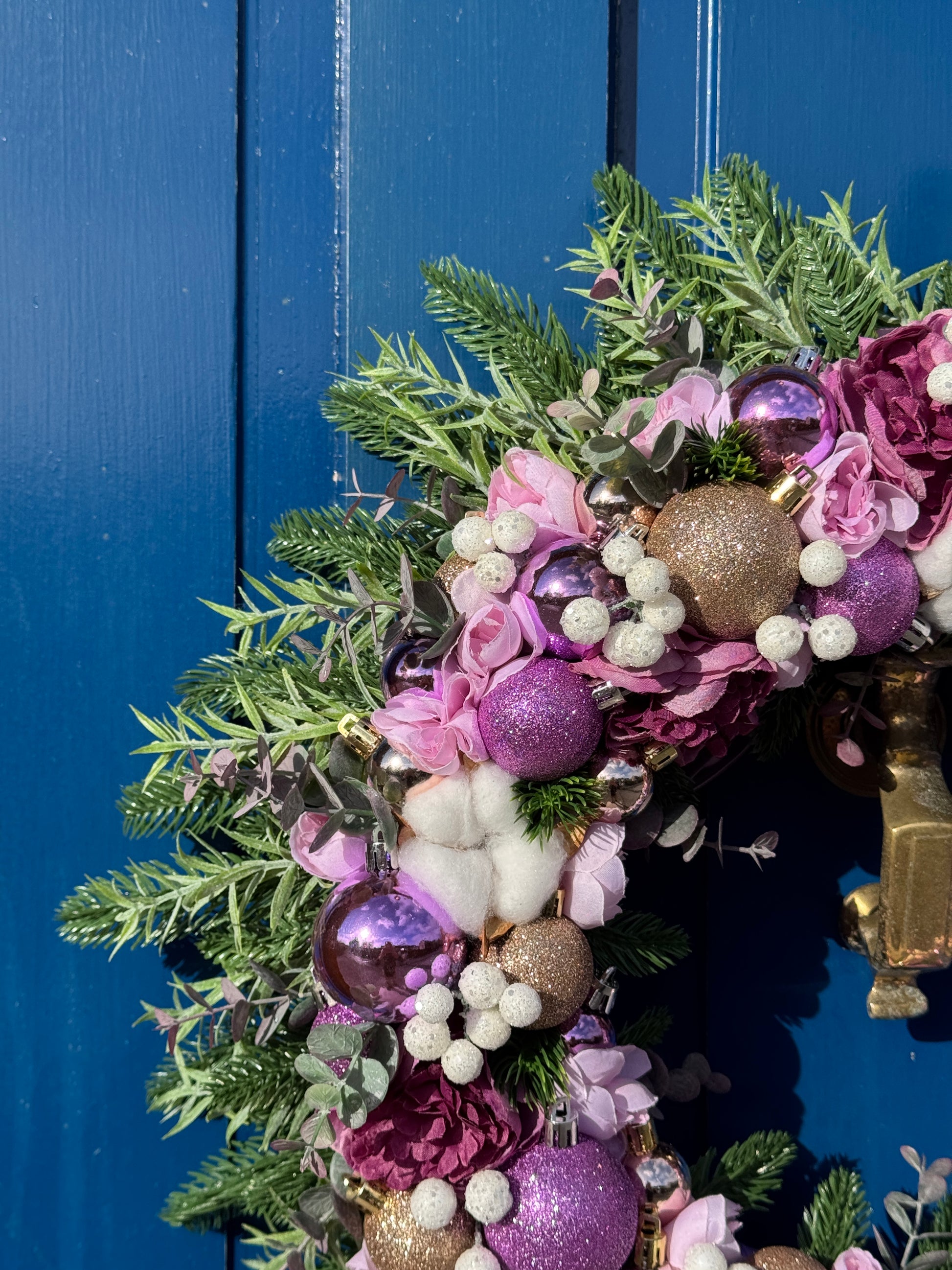 Deep purples, soft cotton, and a touch of gold — this wreath feels like Christmas dressed up for an evening gala.