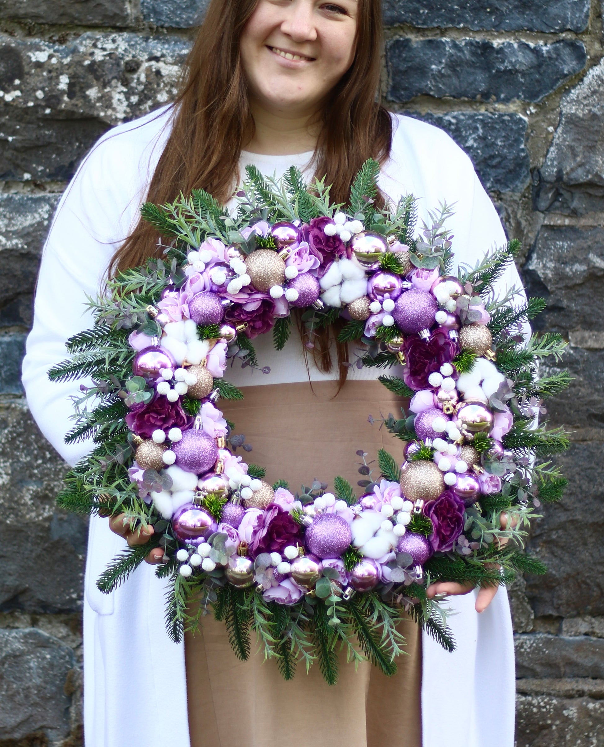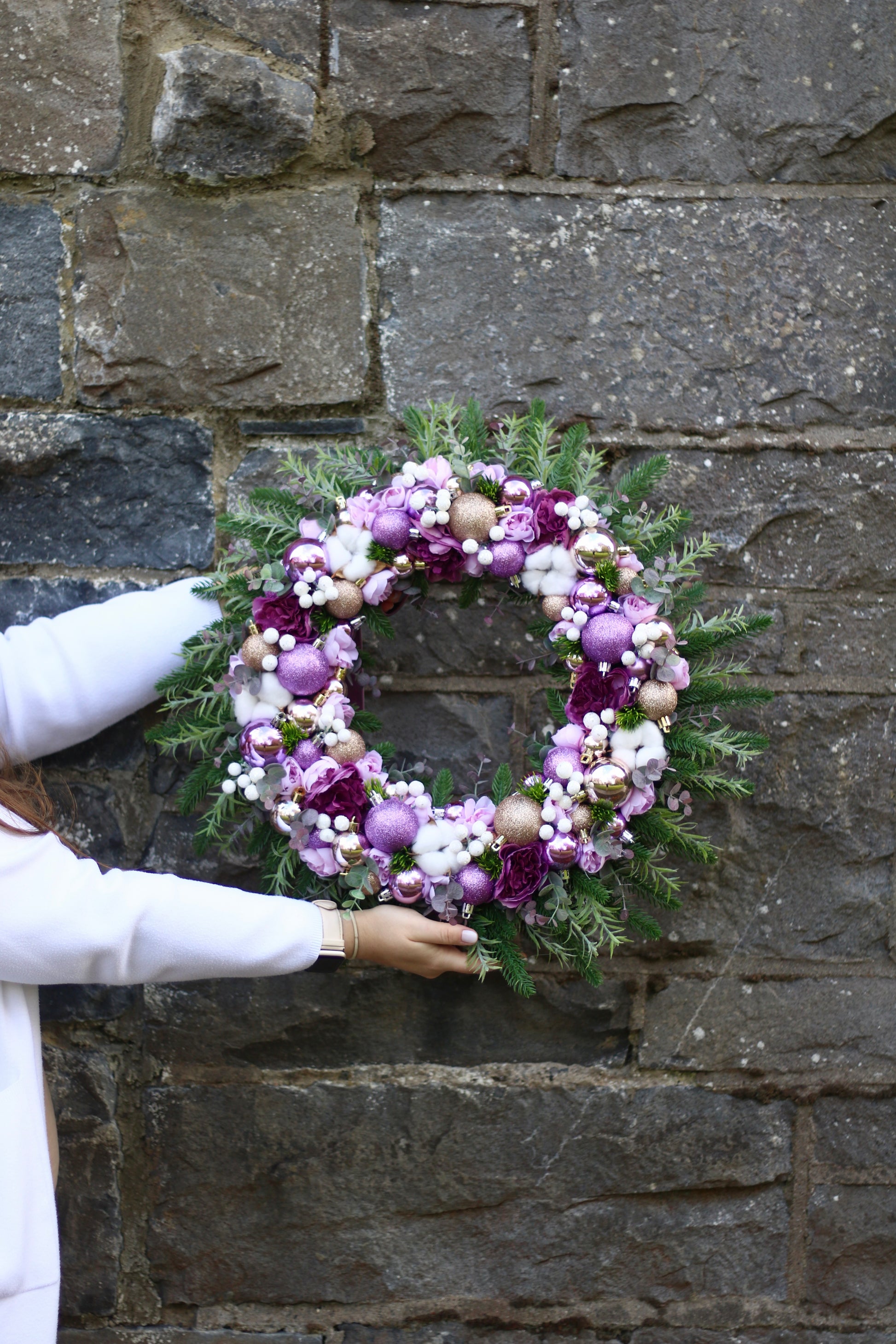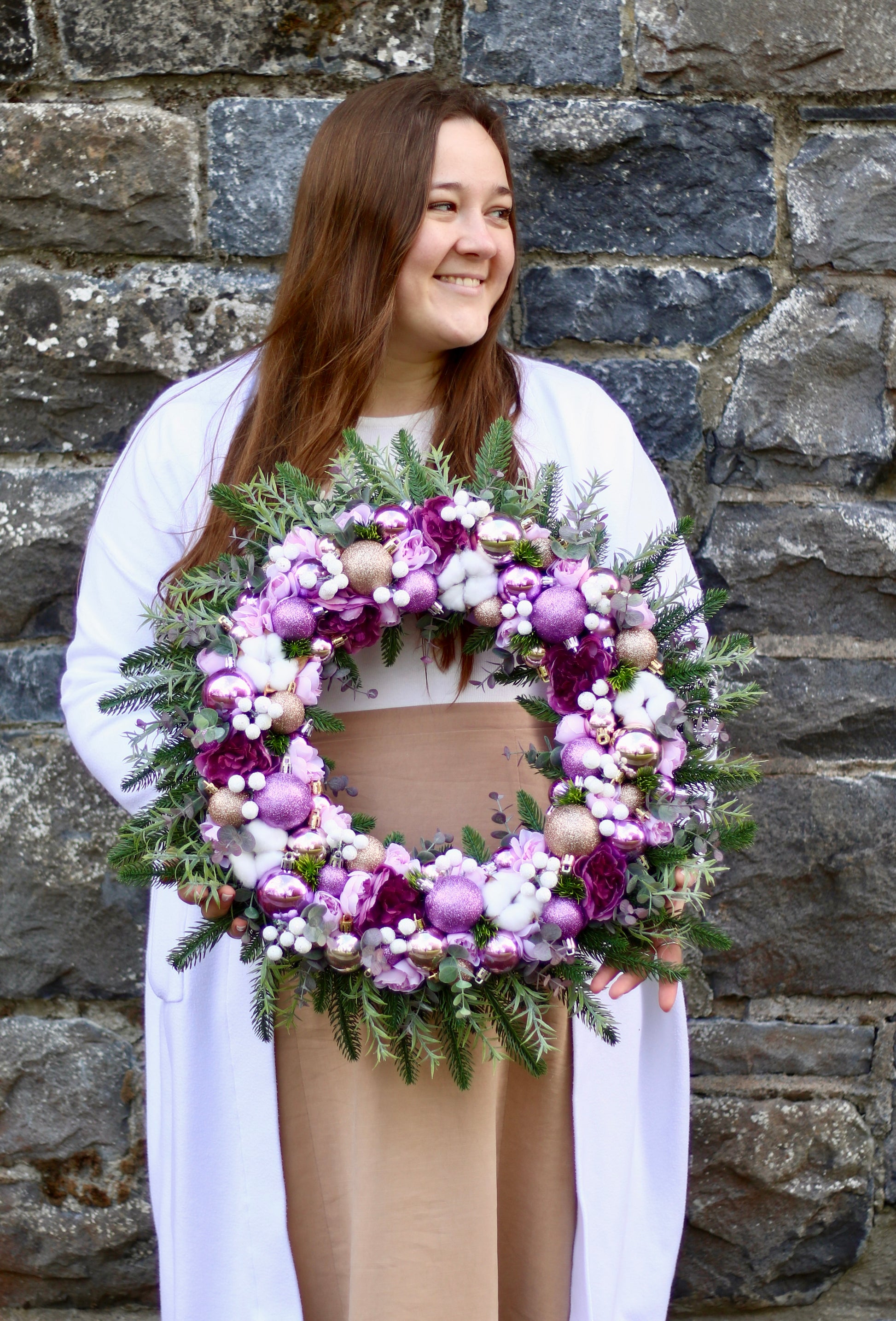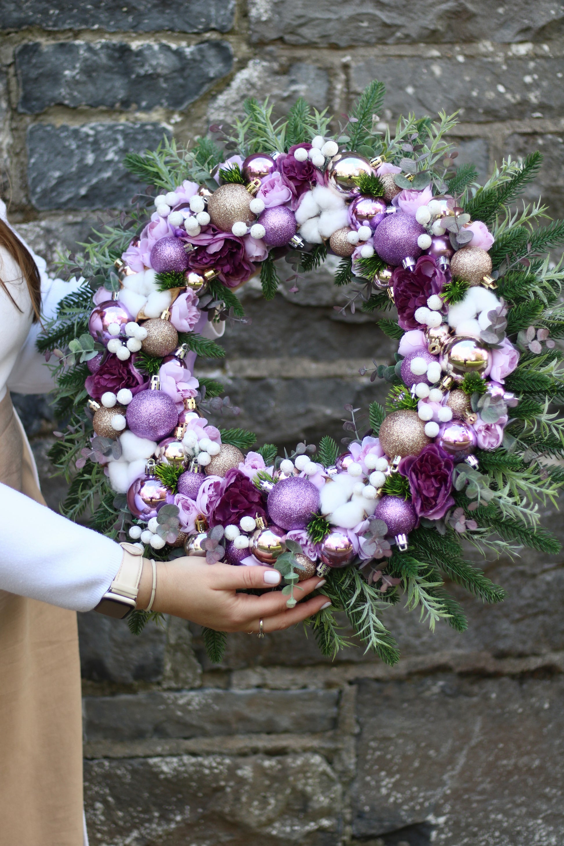 Deep purples, soft cotton, and a touch of gold — this wreath feels like Christmas dressed up for an evening gala.