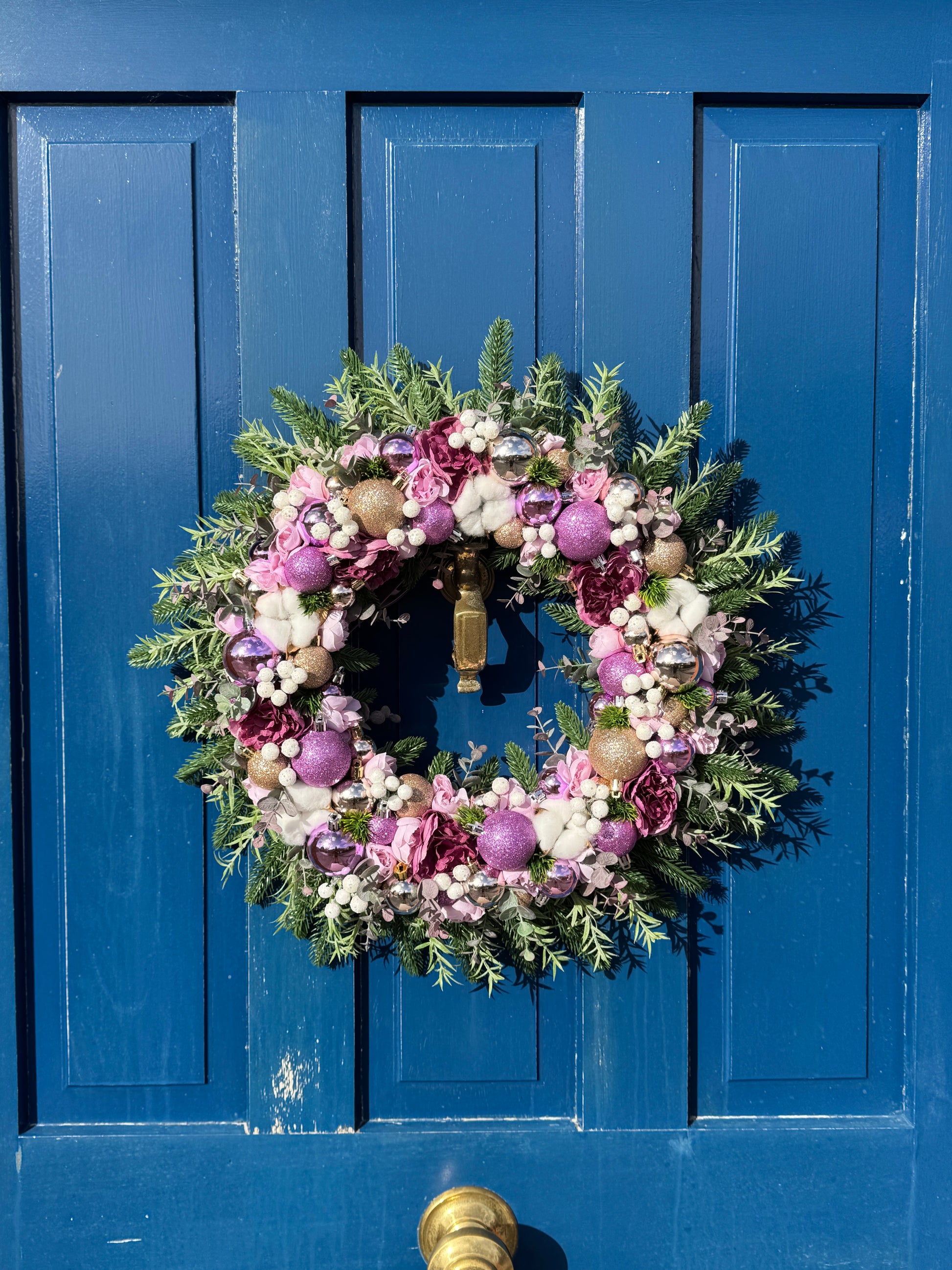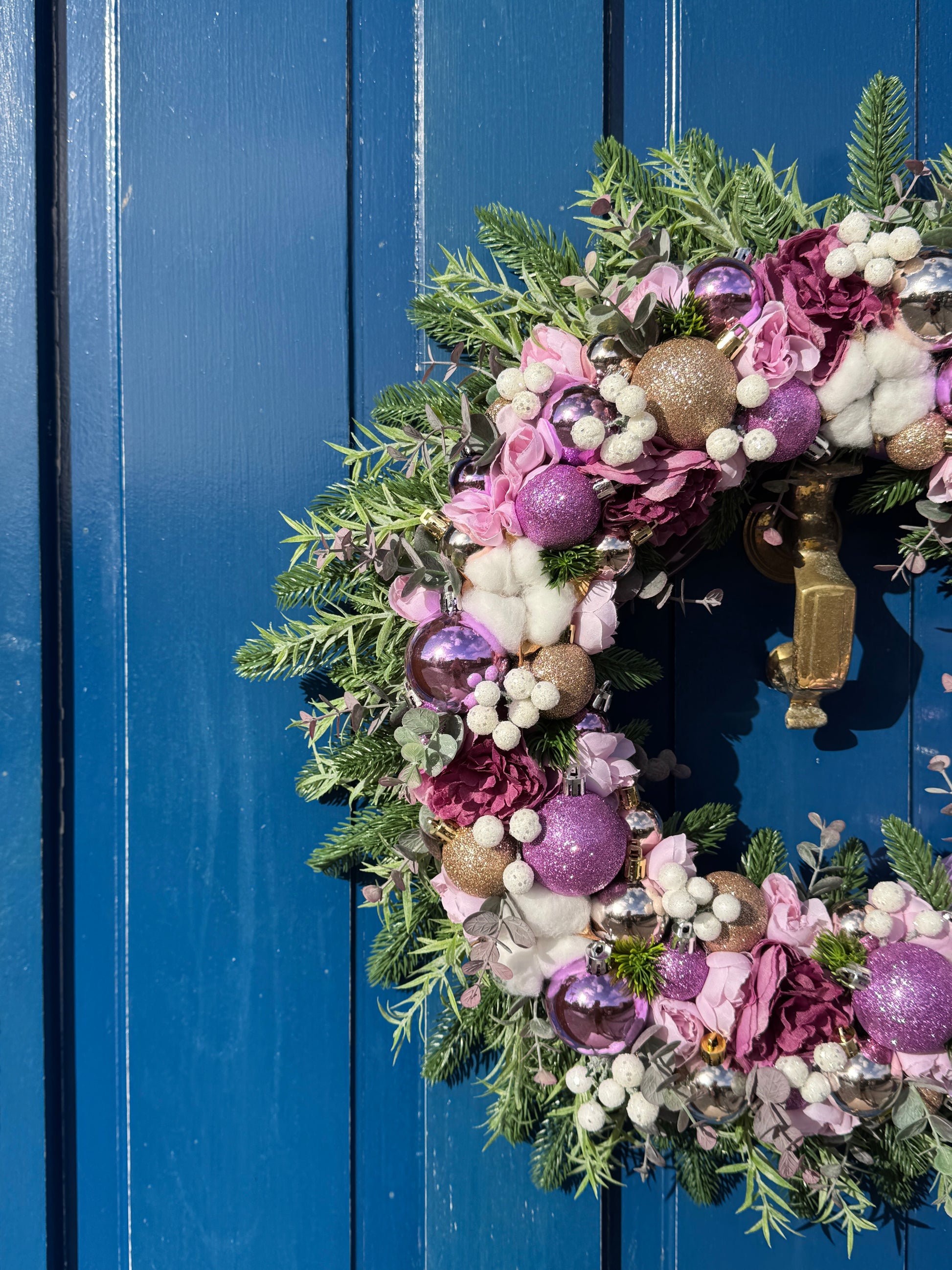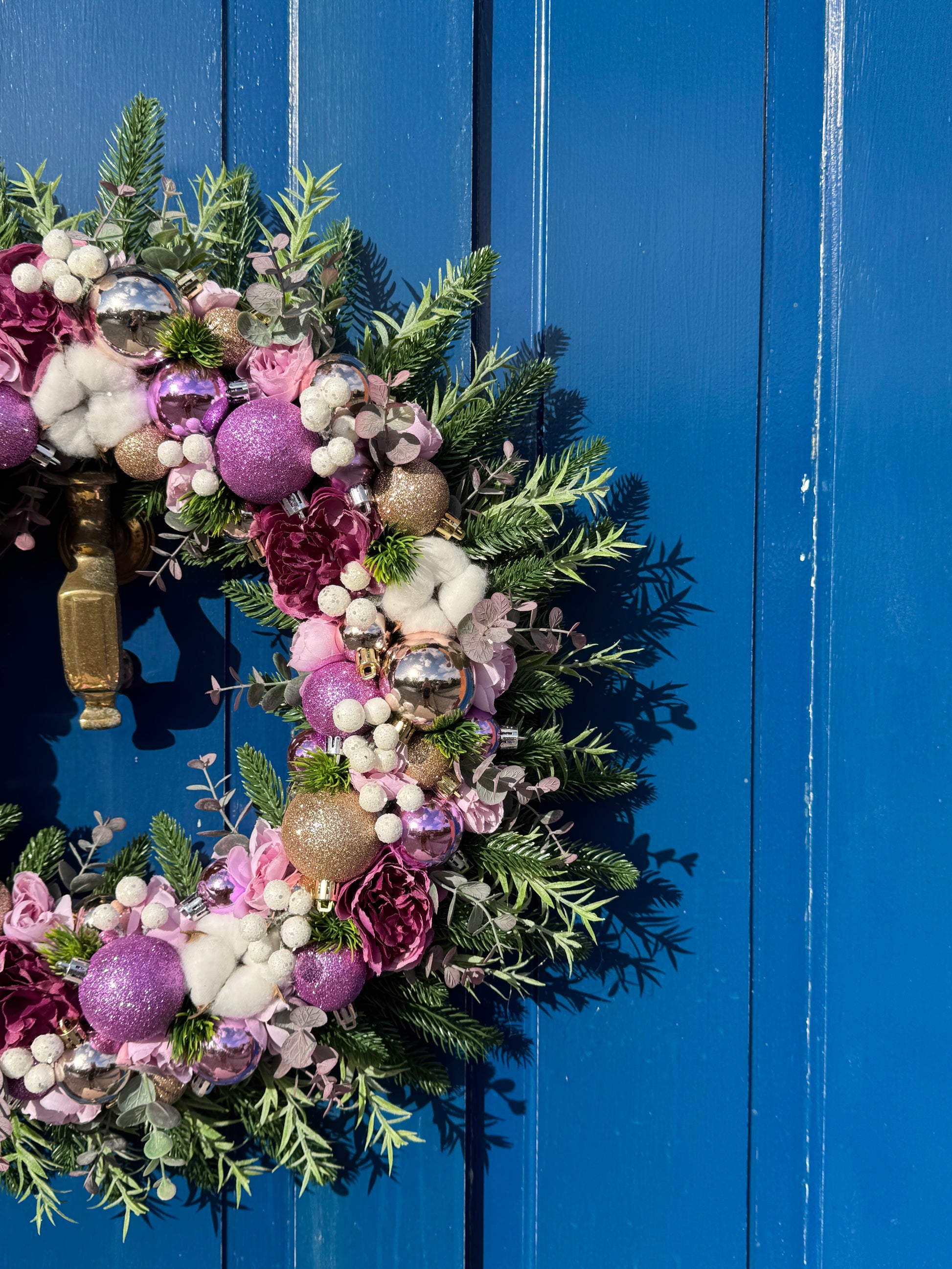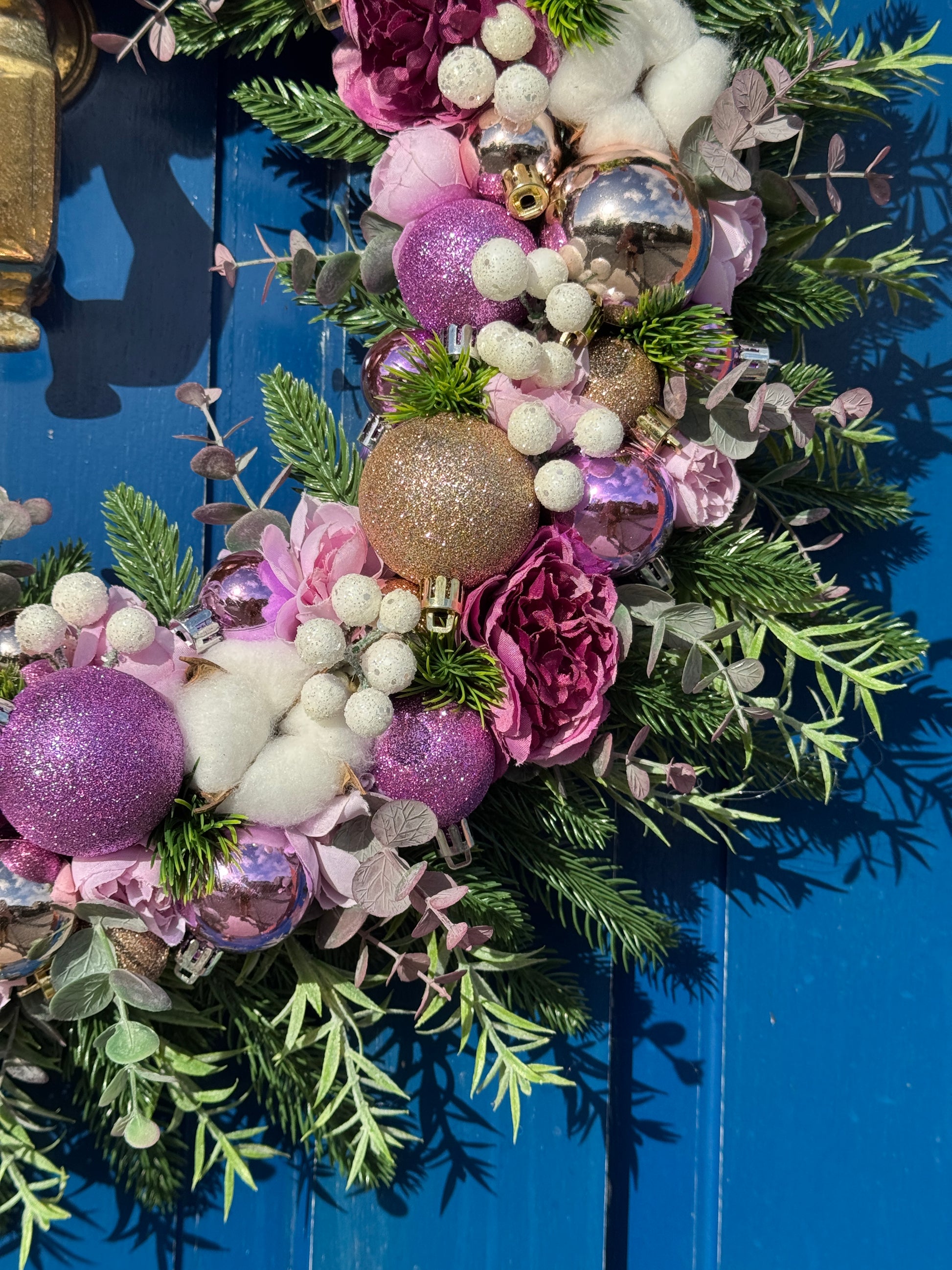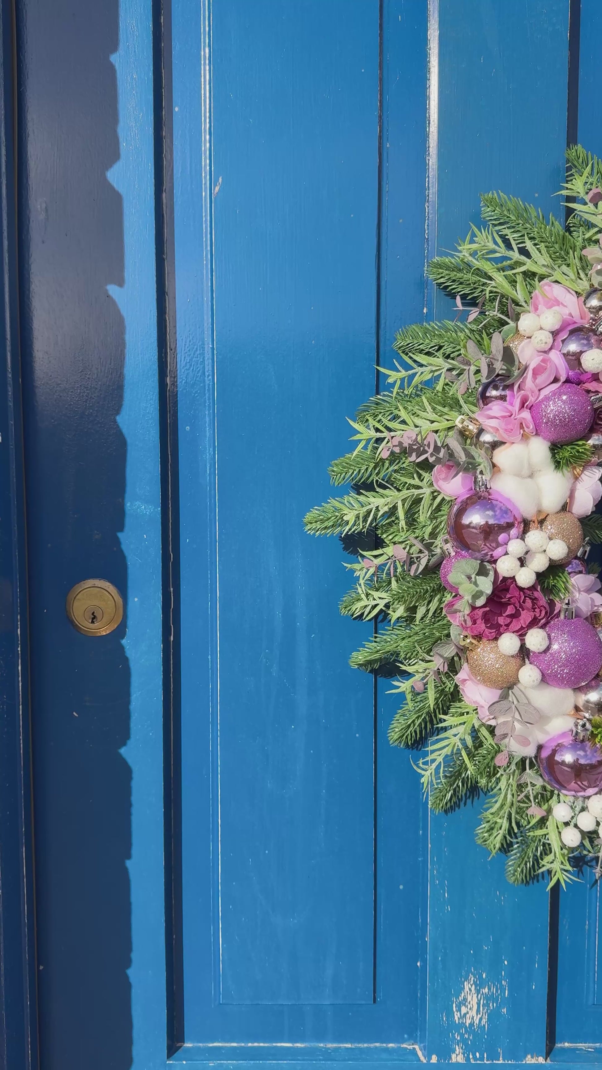 It’s cozy yet refined, festive yet calm. A perfect balance of nature and sparkle, where winter greens meet velvety blooms and glistening ornaments. Hang it on your door, and let it whisper: “Welcome home.”
